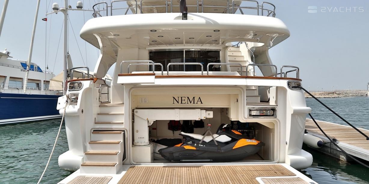 Nema is a 30.24 m / 99′3″ luxury motor yacht. She was built by Benetti in 2007. With a beam of 7.15 m and a draft of 1.79 m, she has a GRP hull and GRP superstructure. This adds up to a gross tonnage of 193 tons. She is powered by engines giving her a maximum speed of 15 knots and a cruising speed of 12 knots. Nema's maximum range is estimated at 2100 nautical miles. The motor yacht can accommodate 8 guests in 4 cabins with an interior design by Francois Zuretti and an exterior design by Stefano Righini.