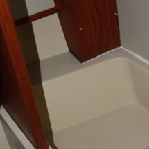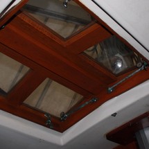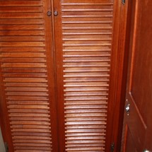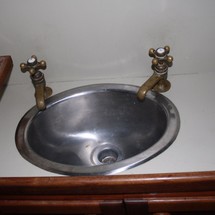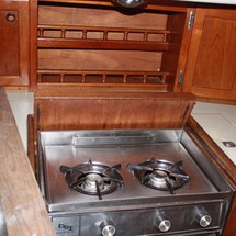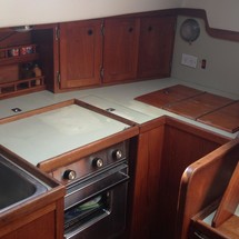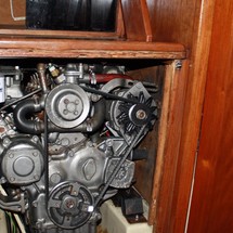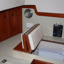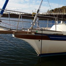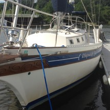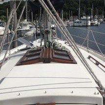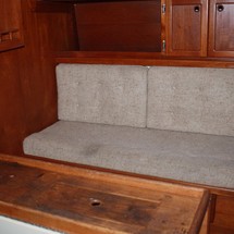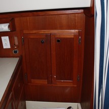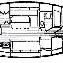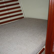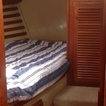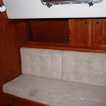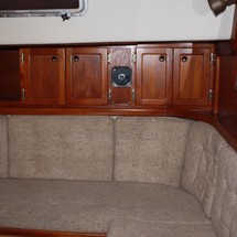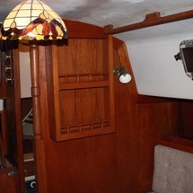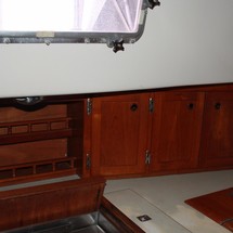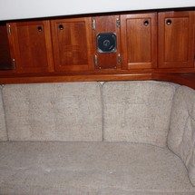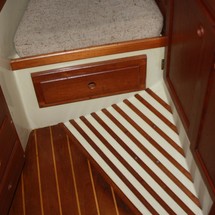 Sleeps 7. Forward cabin with double pullman berth and storage closets, four storage drawers. Aft cabin with double berth to port. The salon contains a settee and dinette to port along with the nav station. The galley has a stainless steel sink with pressure hot and cold water, a 2-burner gimballing stove with oven (CNG 2 tanks) , Microwave, 110v/12volt refrigeration. The enclosed head port side is equipped with a shower and tub Electric flush head, Holding tank and Macerator and Y valve.. Cabin lights, 9 switched 12 V Fan, Air conditioning w reverse cycle heat Plus cabin heater off engine heater. All of the following in Varnished Teak: Rubrail, bowsprit platform, decorative taft rail, handrails cabin top, louvered doors in companionway.
