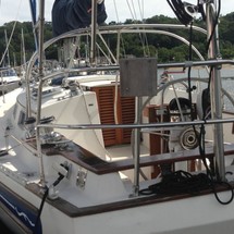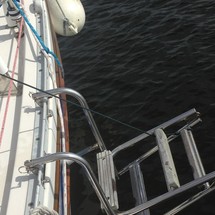 Bow & Stern rails with double lifelines. 2 Anchor's with chain and rope. Electric anchor windlass, Anchor locker/ bow roller. Dock lines, fenders, flares, Dual bilge pumps w/ high water alarm, horn, swim ladder, cockpit dodger, Bimini & Connector cockpit table, Cockpit cushions. Custom winter cover. Exterior teak all varnished, 2 swim ladders