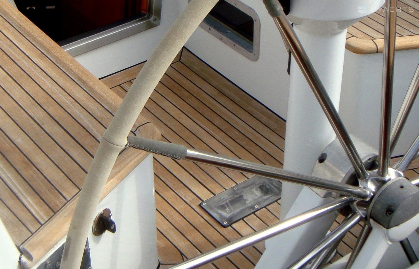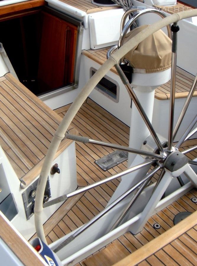 Teek deck Dodger over centre cockpit Dodger over aft cockpit Rigid awning over centre cockpit Sun awning Companionway ladder Carbon fibre gangplank Swimming ladder Winches 2 x Lewmar 66 hydraulic 2 x Lewmar 64 manual 2 x Lewmar 900 electric primaries (primaires) 2 x Lewmar 77 electric, secondaries Rig and deck gear Aluminium mainmast by Rondal, with Harken track and ball race batten cars Aluminium mizzen mast, with Harken track and ball race batten cars Hydraulic powerpack for genoa furler, windlass and primary winches Rondal 200 hydraulic furling unit for headsail Profurl manual furling unit for staysail Hydraulic vangs for main and mizzen Hydraulic backstay