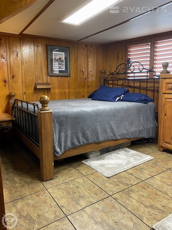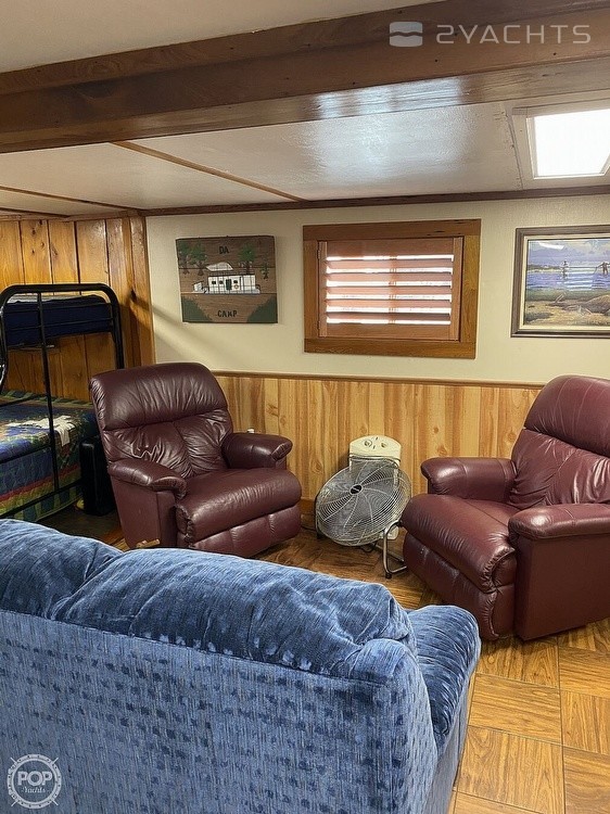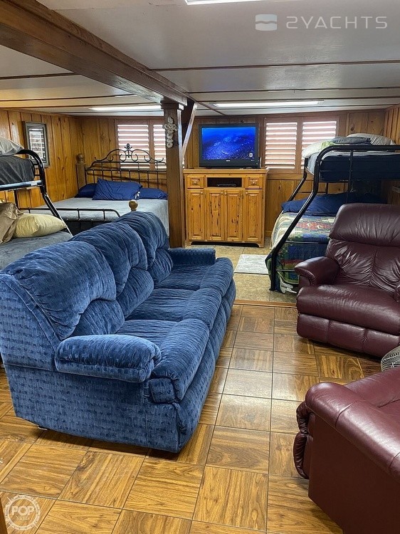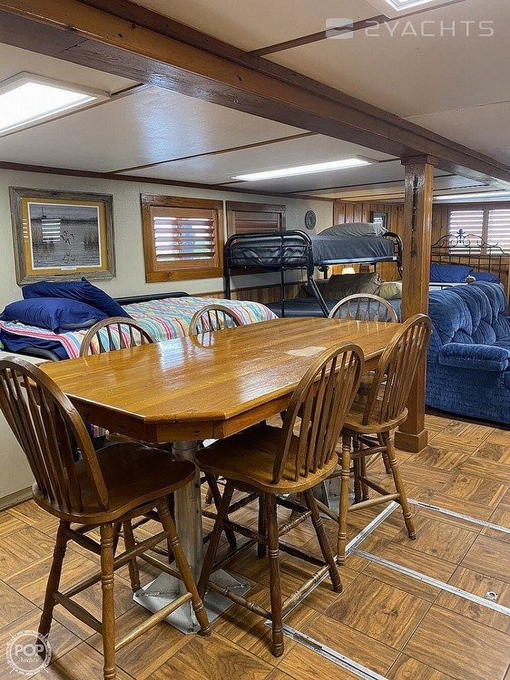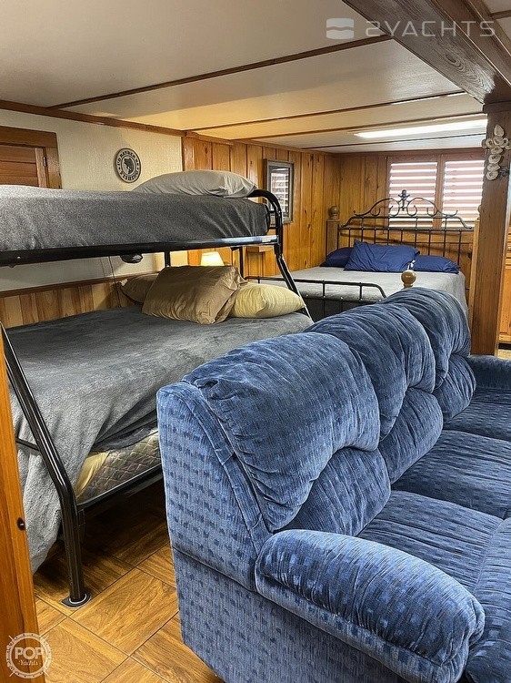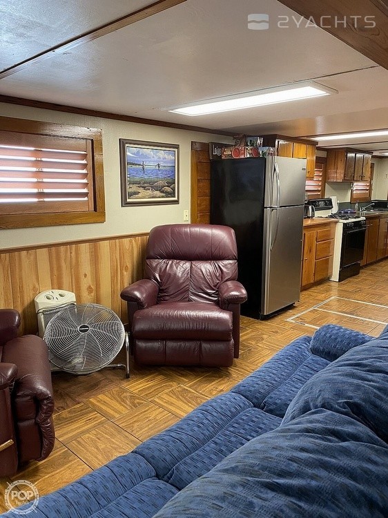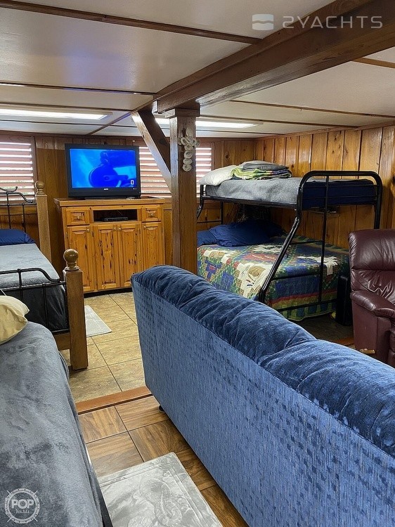 This Houseboat has had major professional renovations and has beautiful cypress wood throughout. It is an open floor plan with a full-sized bathroom. It includes a washer and dryer, air conditioning, a new refrigerator, propane stoves in the kitchen and upstairs, and hot water heaters.