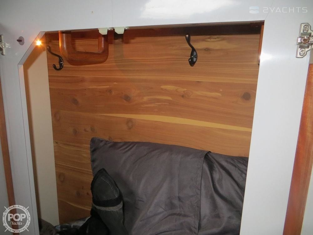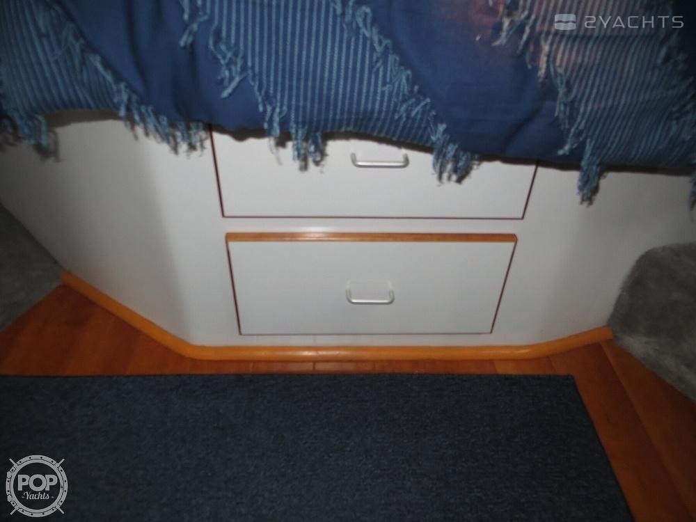 The forward stateroom features a center-forward berth on a pedestal allowing access from either side. There is a storage compartments on the starboard side. To port is a convenient sink with faucet and cabinet storage.