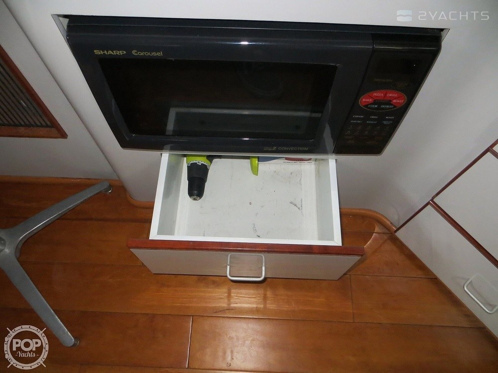 The galley is has a 3-burner electric stove with cover to prepare food, double Stainless-steel sink, refrigerator/freezer, a microwave and cabinet and cupboard storage.