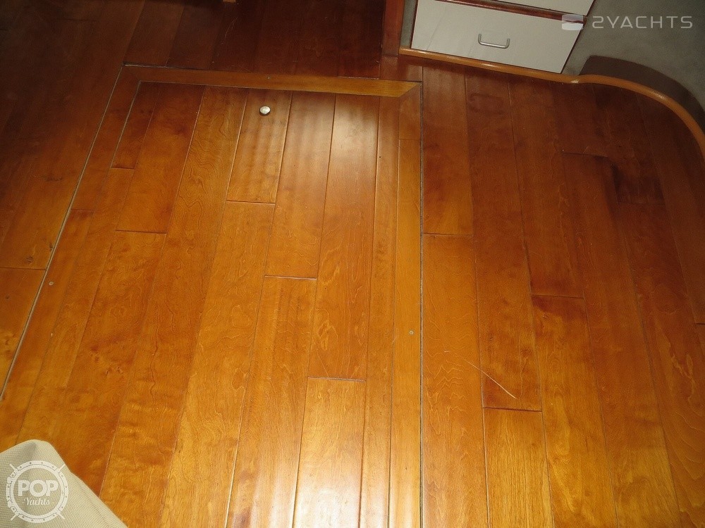The salon flooring is a laminant for easy clean up. A large j-shaped settee with storage beneath the seat cushions is located on the port side of the salon. There is a TV mounted facing back into the salon area.