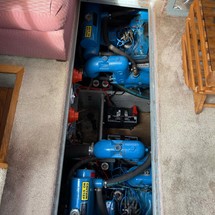 Replace AC/DC Norcold fridge/freezer brand new 7-9-22. 2 year old ideal windlass motor, 4 year old carburators, 1 year old spark plugs, Brand new dual horn. 2 brand new bilge blowers. Kohler 4 cylinder generator. Halon auto fire extiguisher. 12 gal water heater. Synchronizer: Aqua Meter digital tachs/synchronizer. The transmissions are Borg Warner Velvet Drives with a 2.91:1 ratio. 3 batteries.
