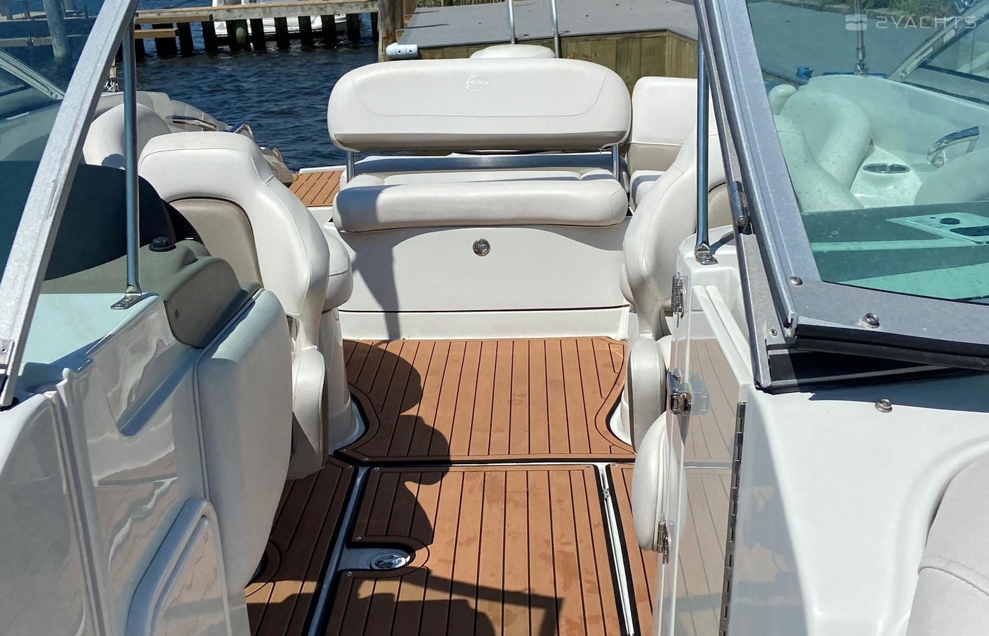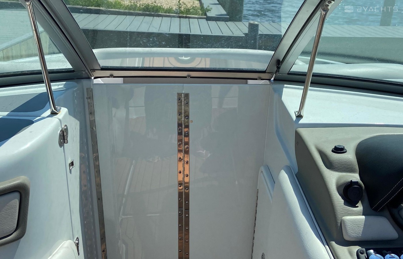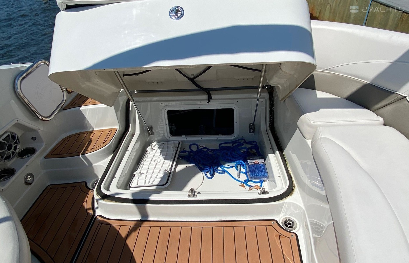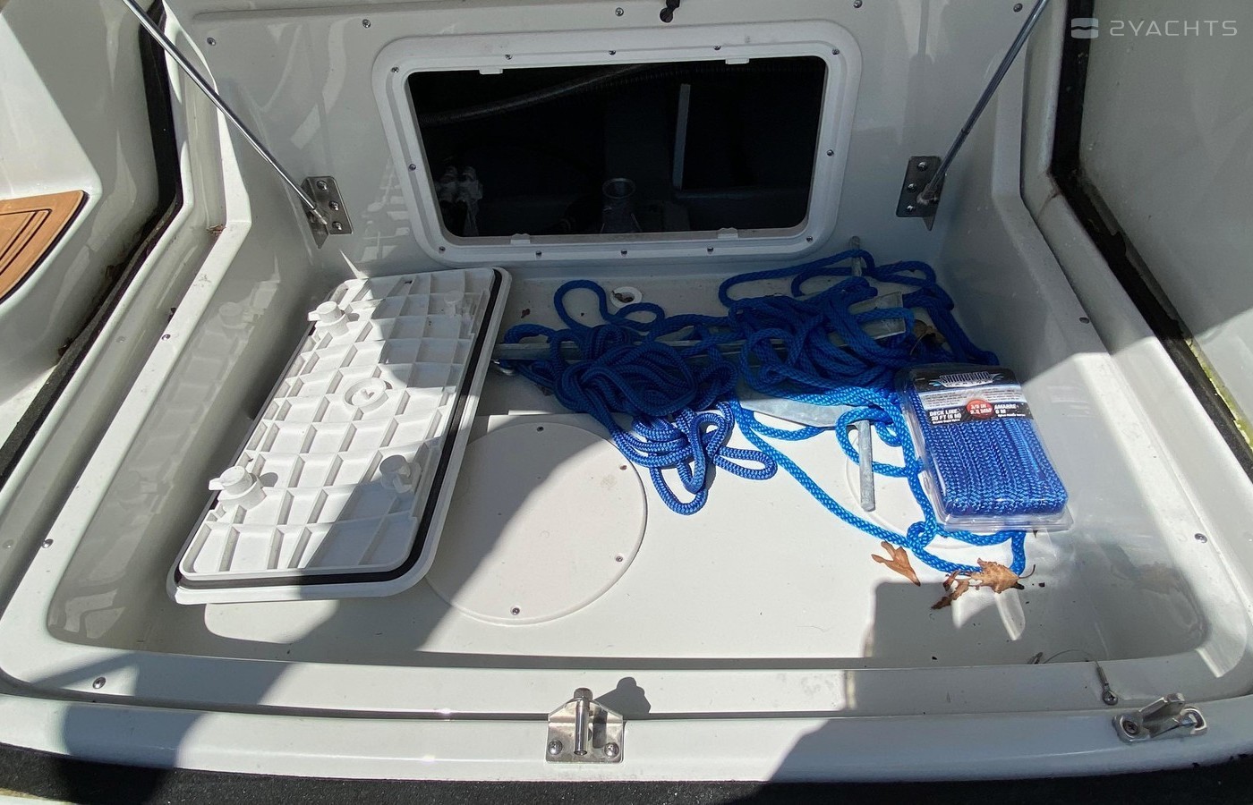 The walk thru transom will take you into the luxurious and spacious J-Shape cockpit seating with driver and passenger flip-up bucket seats and creature comforts galore. Cockpit carpet snaps out for easy cleaning. Stainless steel grab handles and cupholders are within easy reach no matter where you are sitting. There’s a 100 plus quart integrated cockpit cooler and a portable side mount table that stows away in the undermount cockpit storage drawer when not in use. The large fiberglass storage tub beneath the aft hatch is huge and is protected with an impact resistant, non-marring coating. The enclosed head compartment is another much appreciated feature and includes a handheld shower, beautiful cabinetry with a sink and custom granite countertop, opening portlight and porta potti.