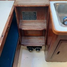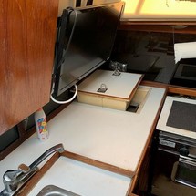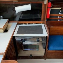 The galley is equipped with a built-in ice chest and an alcohol stove and oven.