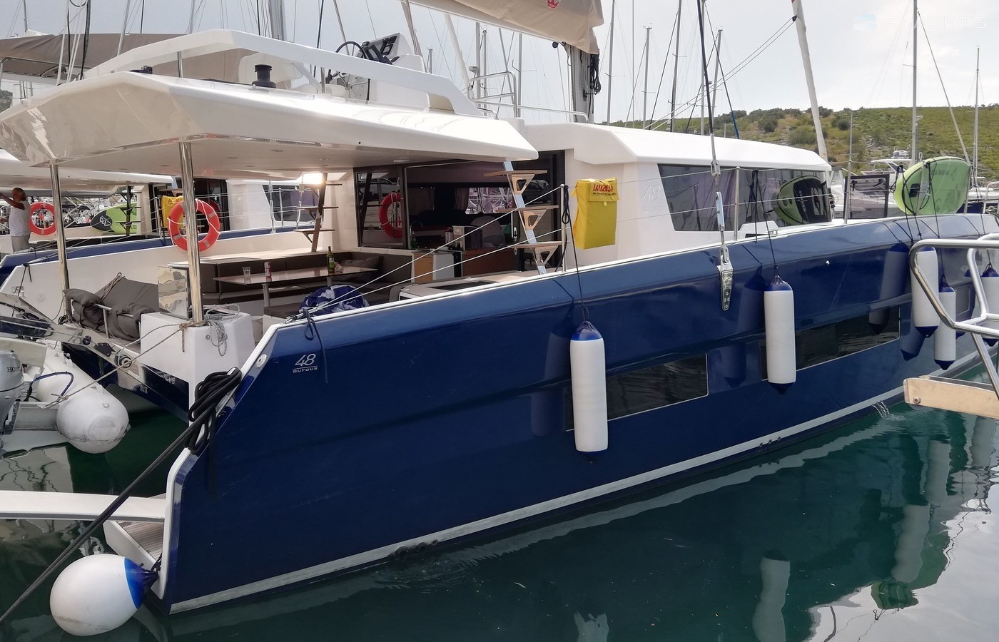 6-cabin catamaran Dufour 48 - Shu was built in 2019, and it is docked in Marina Kremik, Croatia.