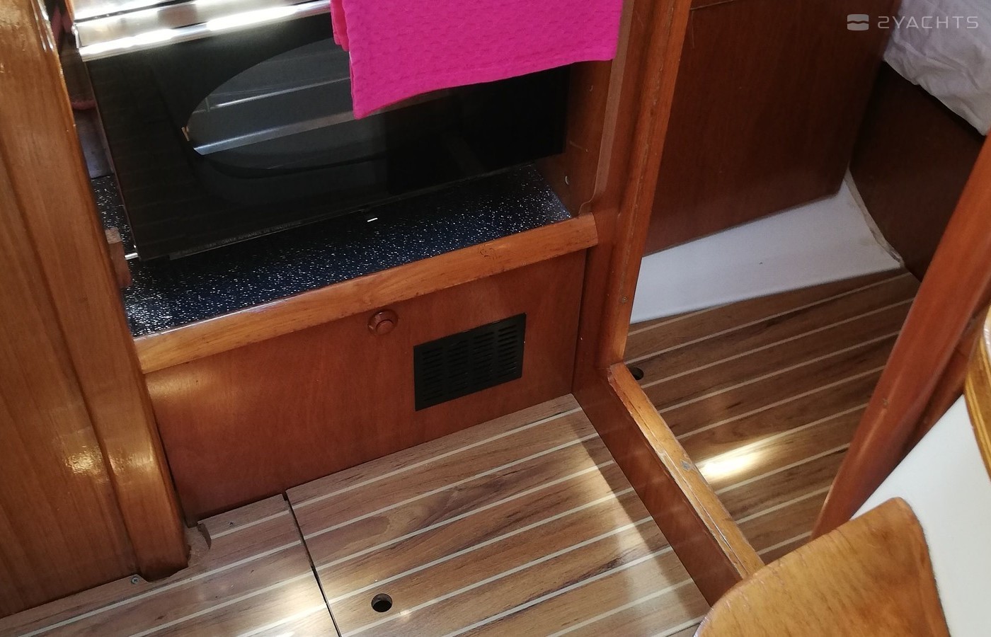 Boat equipment features classical mainsail, bimini and outside gps plotter. It also boasts an an audio system, outside speakers and inside speakers. The fully-equipped galley includes a coffee machine, oven, cooker, sink and kitchen utensils.