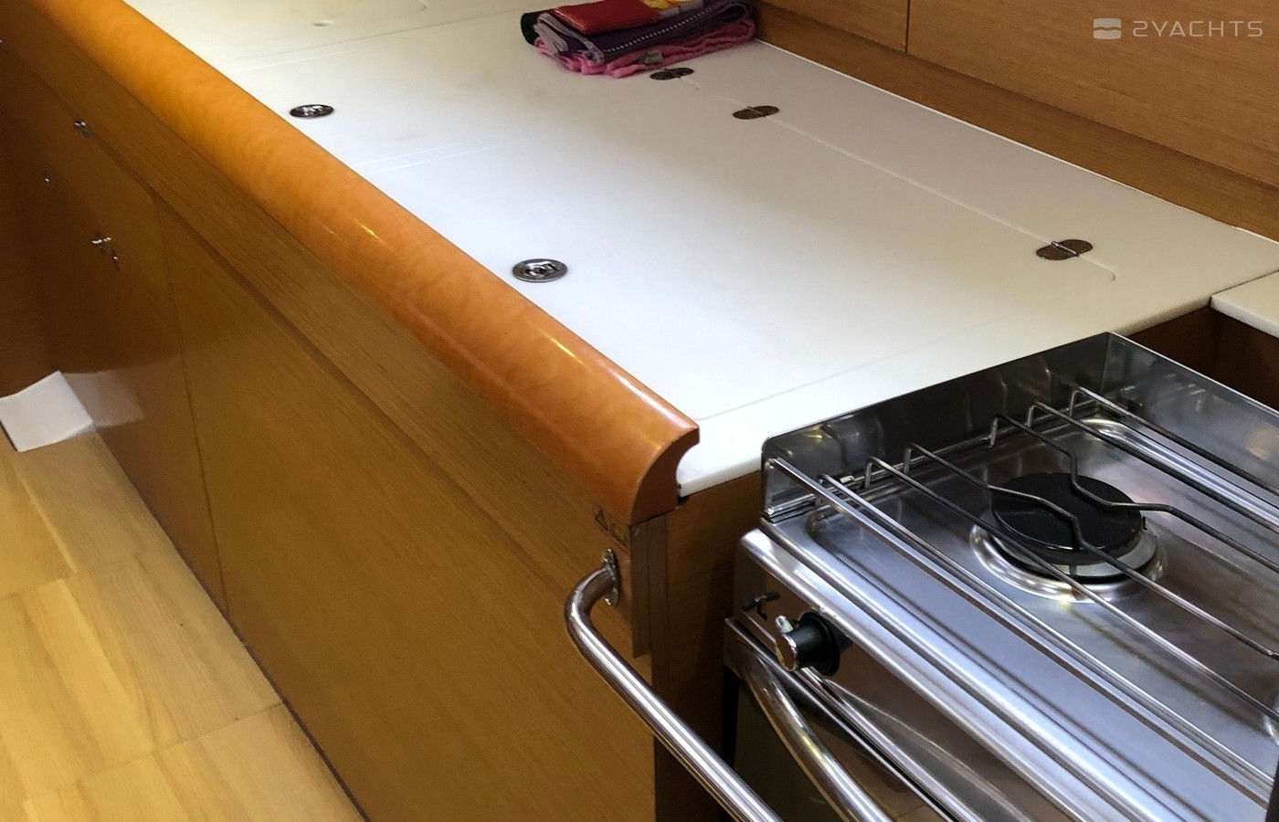 Boat equipment features classical mainsail, bimini and bow thruster. It also boasts an an audio system, outside speakers and inside speakers. The fully-equipped galley includes an oven, cooker, sink and kitchen utensils.
