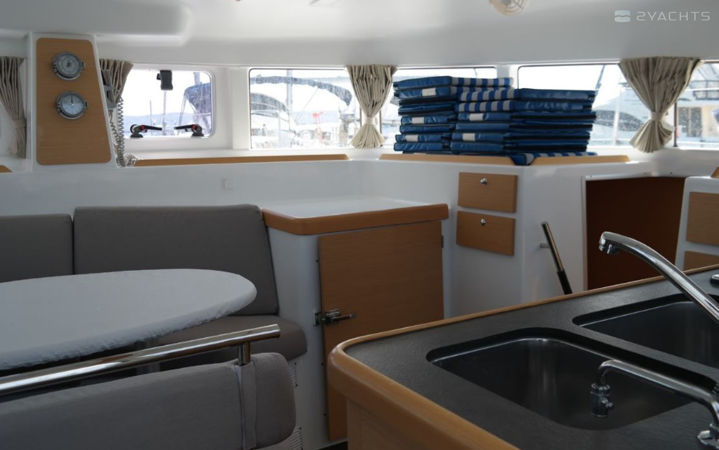 Boat equipment features classical mainsail, salon gps plotter and bimini. It also boasts an an audio system, outside speakers and inside speakers. The fully-equipped galley includes an oven, cooker, sink and kitchen utensils.