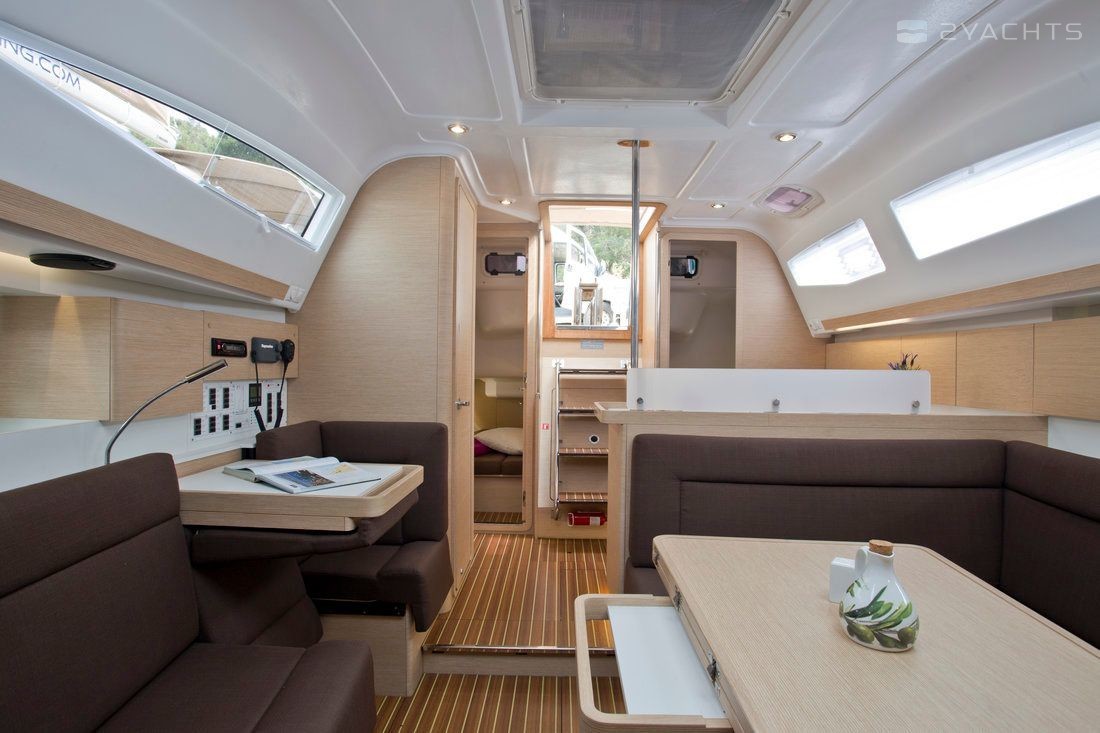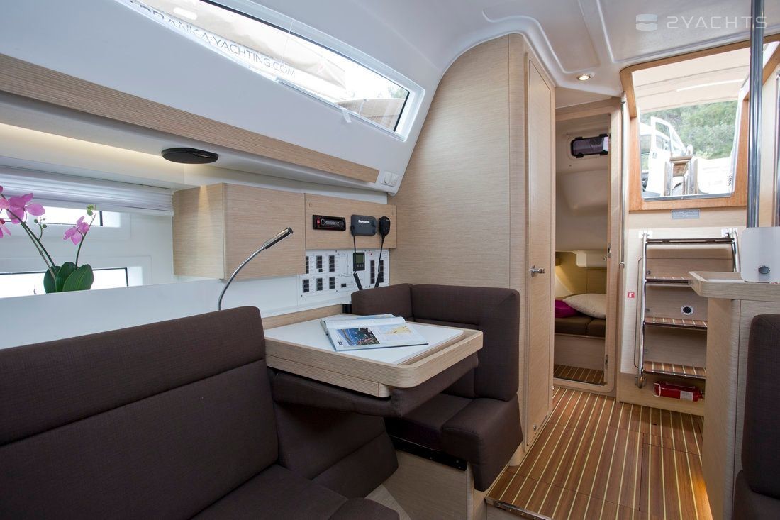 Boat equipment features classical mainsail, bimini and bow thruster. It also boasts a heating, an audio system, outside speakers and inside speakers. The fully-equipped galley includes an oven, cooker, sink and kitchen utensils.