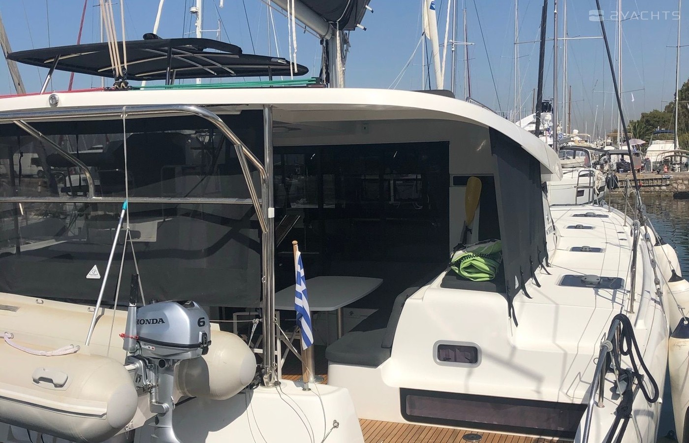 This catamaran is operated by the charter company Puresailing Yachting.