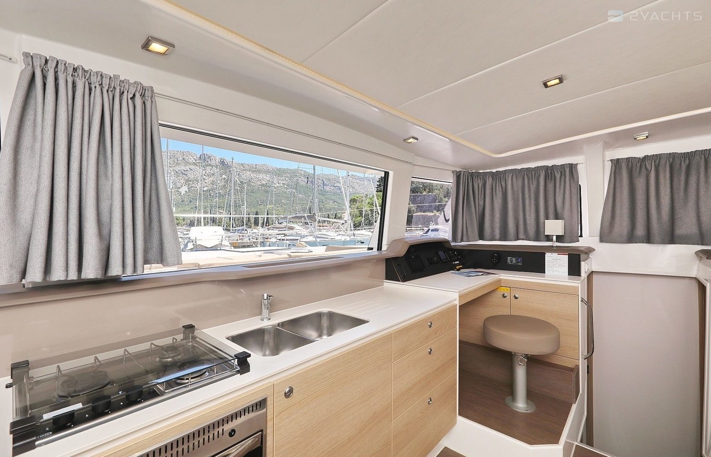 Boat equipment features classical mainsail, electric winches, bimini and outside gps plotter. It also boasts a flat screen tv, an audio system, outside speakers and inside speakers. The fully-equipped galley includes an ice maker, freezer, coffee machine, oven and cooker.