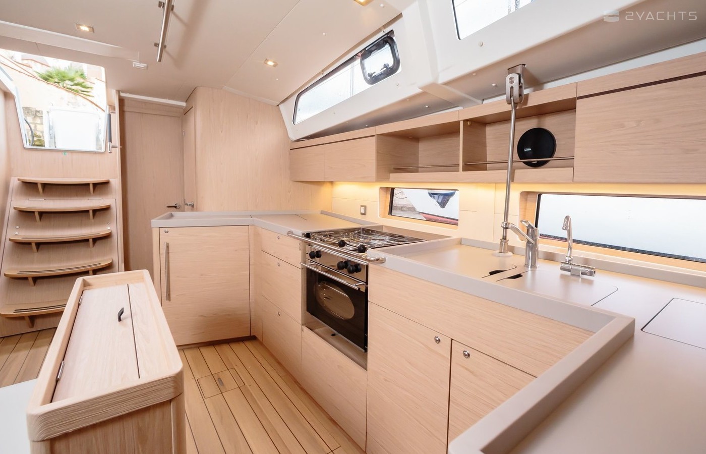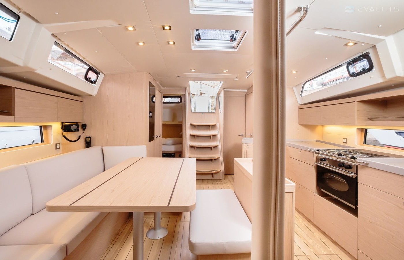 Boat equipment features rolling mainsail, electric winches, bimini and bow thruster. It also boasts a heating, air conditioning, an audio system, outside speakers and inside speakers. The fully-equipped galley includes a microwave, coffee machine, oven, cooker and sink.