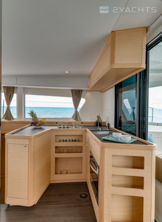 Boat equipment features classical mainsail, bimini and outside gps plotter. It also boasts a flat screen tv, an audio system, outside speakers and inside speakers. The fully-equipped galley includes an oven, cooker, sink and kitchen utensils.