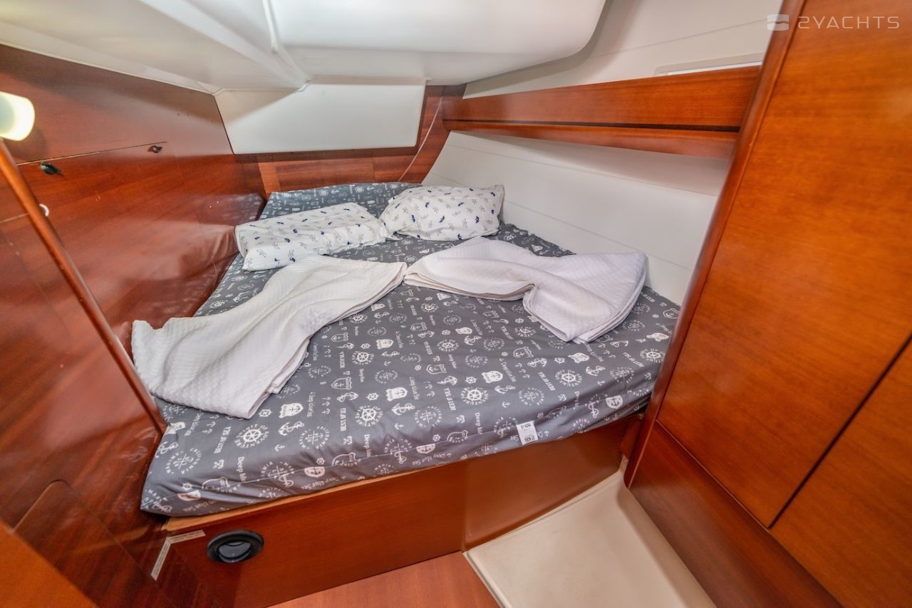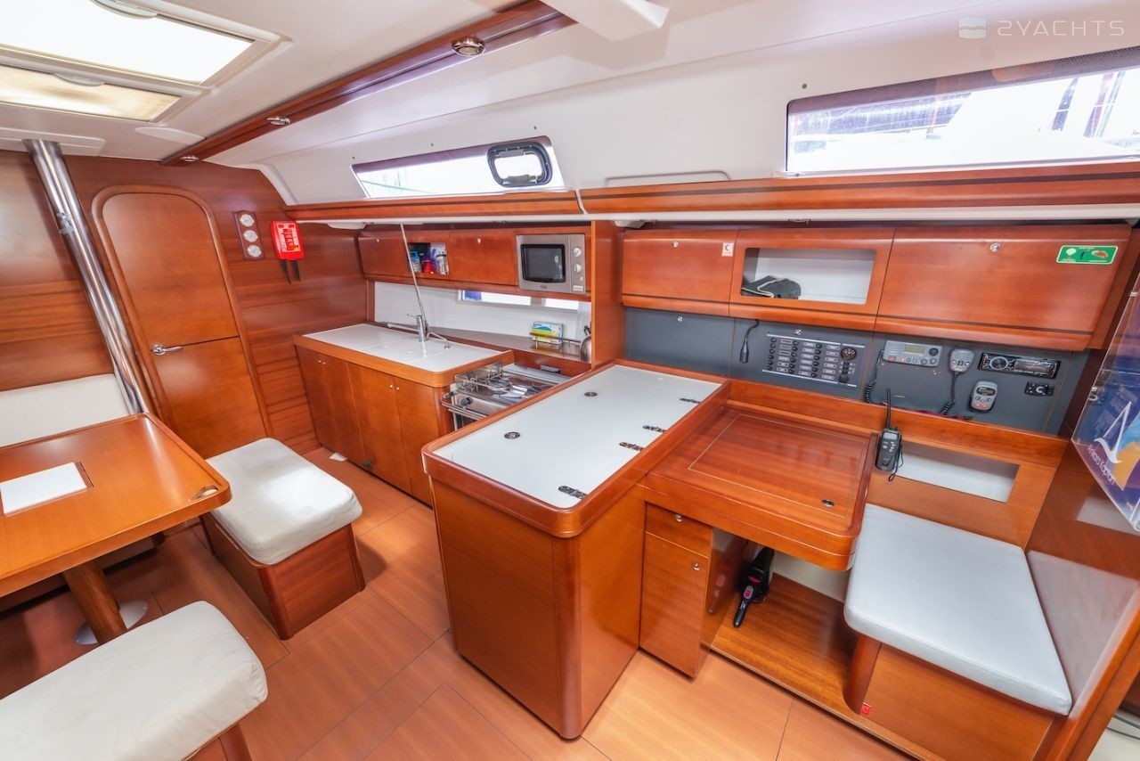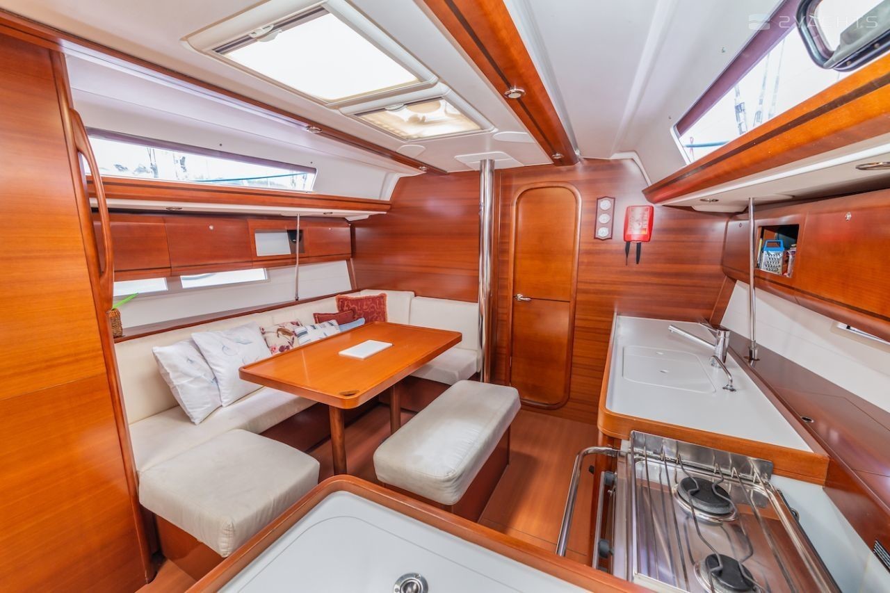 Boat equipment features classical mainsail, solar panels, bimini and outside gps plotter. It also boasts a heating, an audio system, outside speakers and inside speakers. The fully-equipped galley includes a microwave, oven, cooker, sink and kitchen utensils.