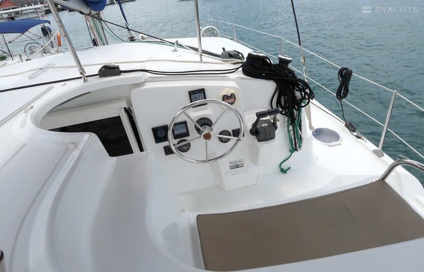 This catamaran is operated by the charter company Mermer Location.