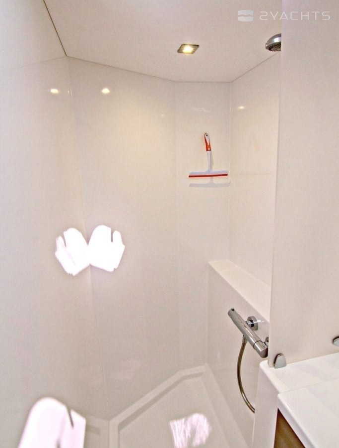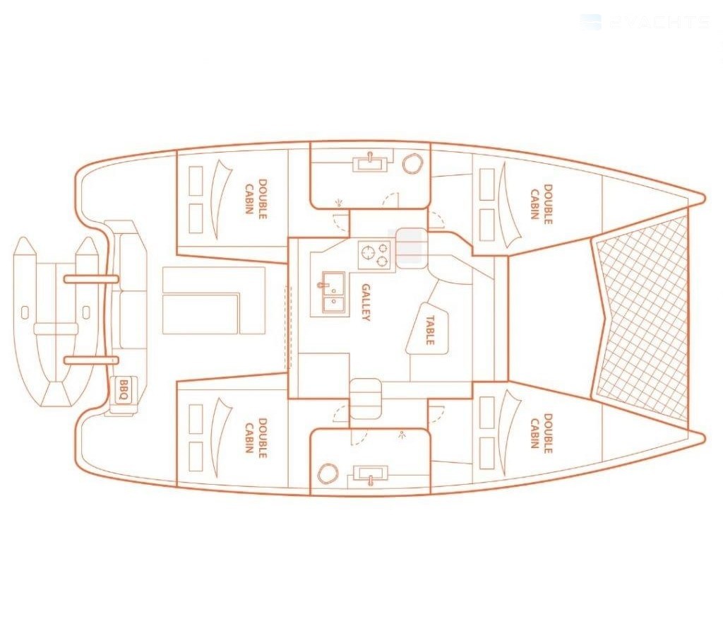 Boat equipment features classical mainsail, electric winches, bbq, bimini and outside gps plotter. It also boasts a flat screen tv, an audio system, outside speakers and inside speakers. The fully-equipped galley includes a microwave, freezer, oven, cooker and sink.