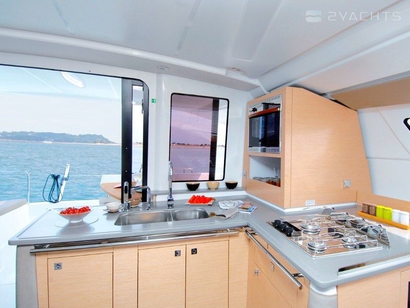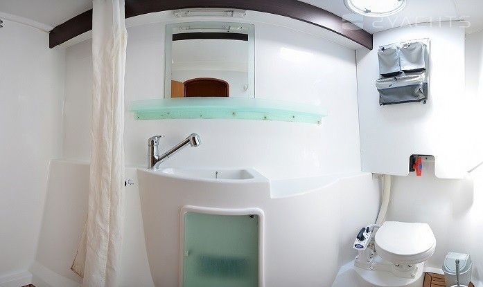 Boat equipment features classical mainsail, electric winches, bimini and outside gps plotter. It also boasts an an audio system, outside speakers and inside speakers. The fully-equipped galley includes an oven, cooker, sink and kitchen utensils.