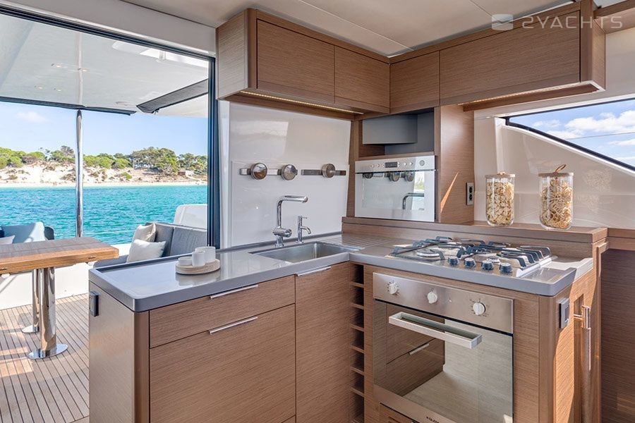 Boat equipment features classical mainsail, generator, bimini and outside gps plotter. It also boasts a heating, air conditioning, an audio system, outside speakers and flybridge. The fully-equipped galley includes a dishwasher, ice maker, oven, cooker and sink.