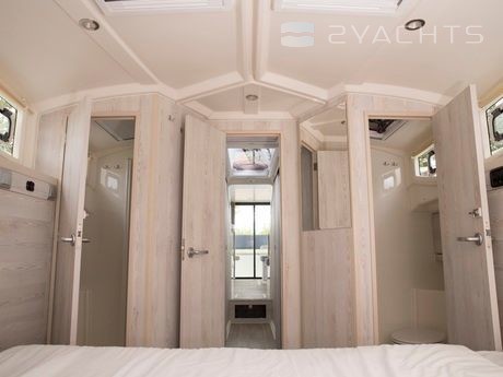 The living area of this houseboat consists of 3 cabins and accommodates 7 people. A shower is at the guests' disposal and there are 3 toilets on board.