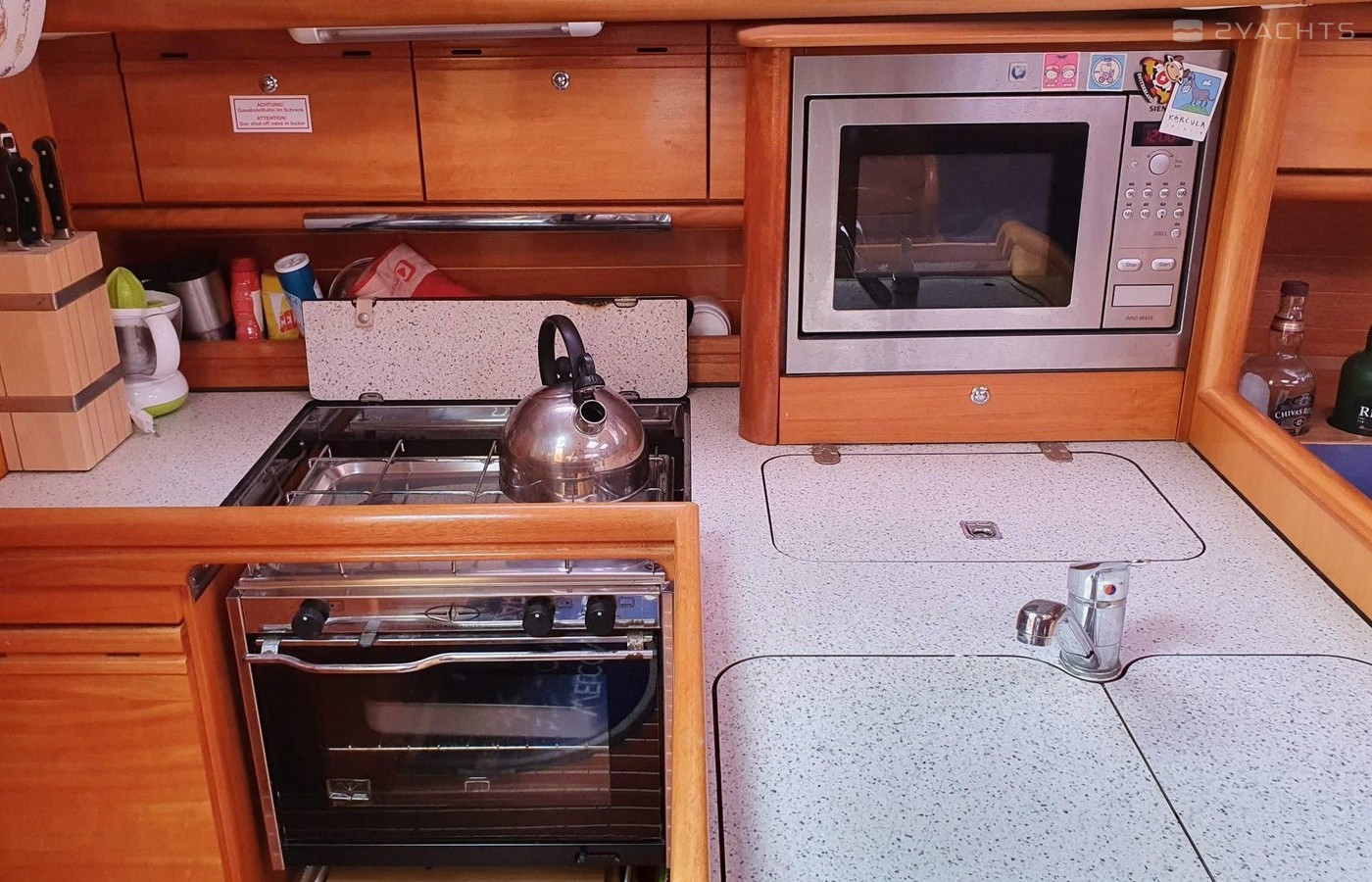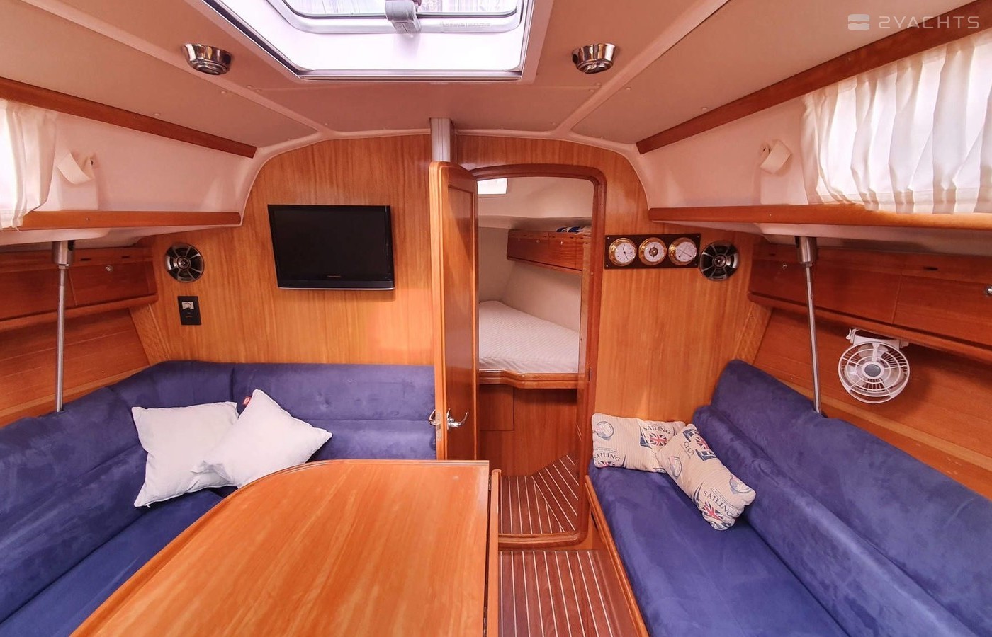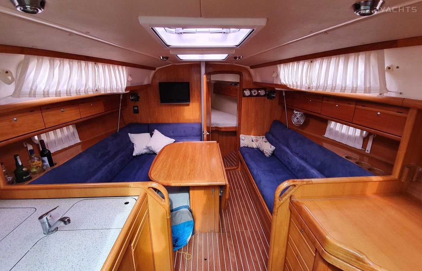 Boat equipment features rolling mainsail, bimini and outside gps plotter. It also boasts a flat screen tv, an audio system and inside speakers. The fully-equipped galley includes a microwave, oven, cooker, sink and kitchen utensils.
