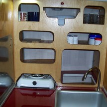 Boat equipment features classical mainsail and solar panels. The fully-equipped galley includes a cooker, sink and kitchen utensils.
