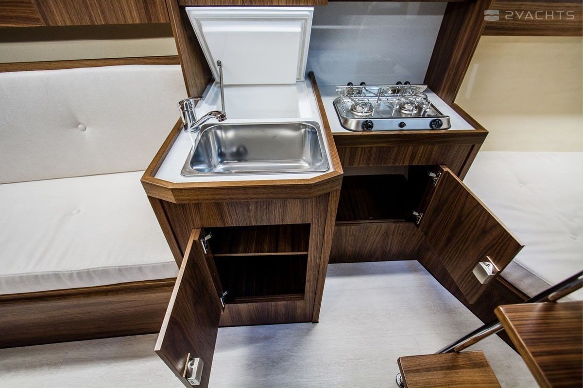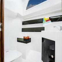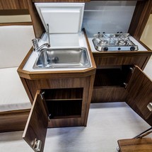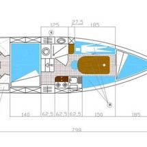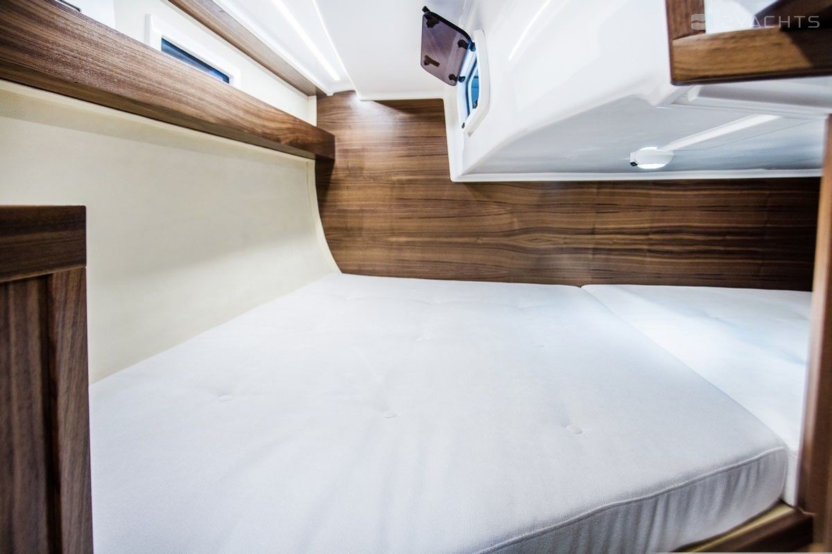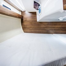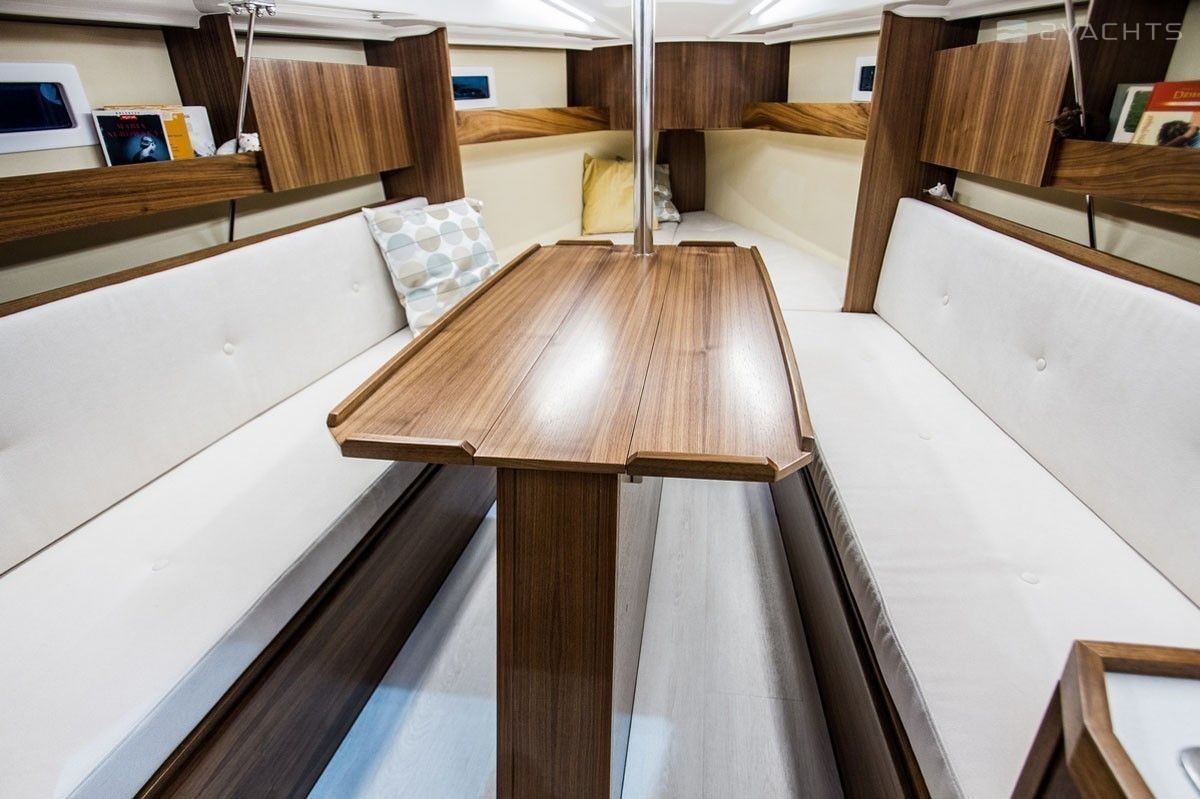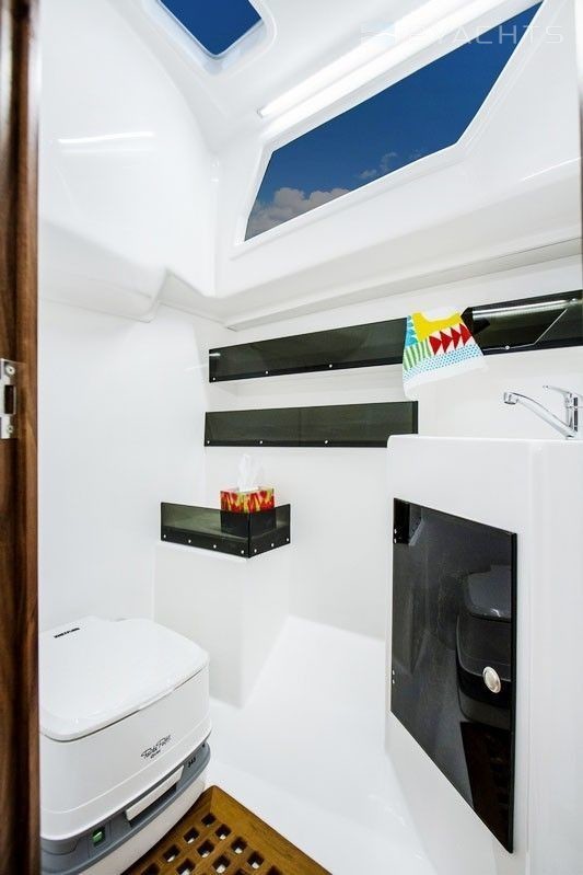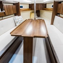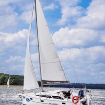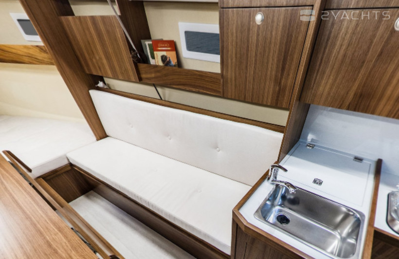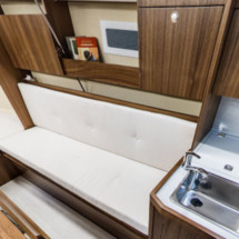 Boat equipment features classical mainsail. It also boasts a heating, an audio system and inside speakers. The fully-equipped galley includes a cooker, sink and kitchen utensils.