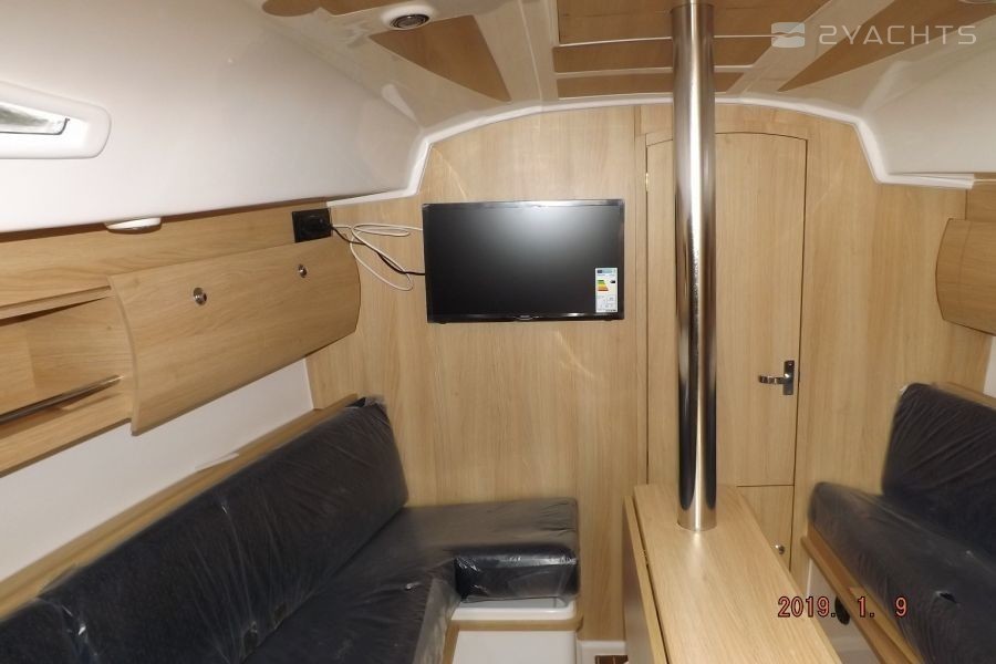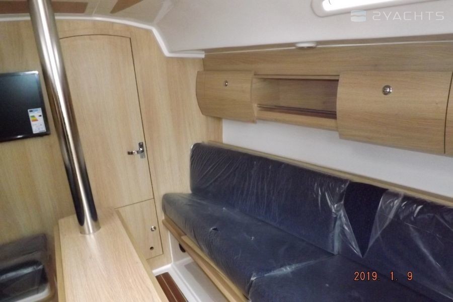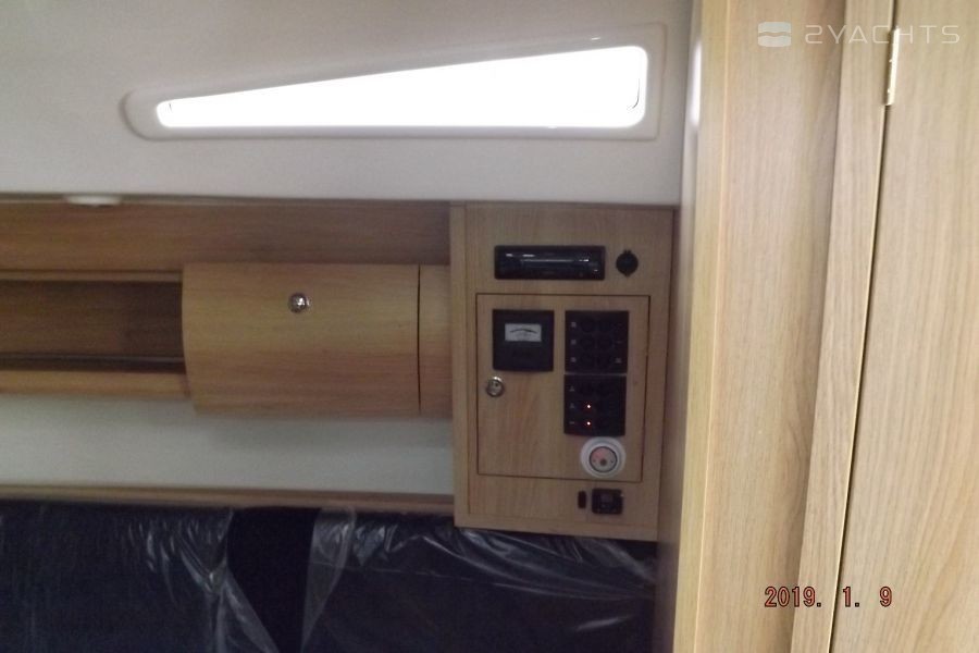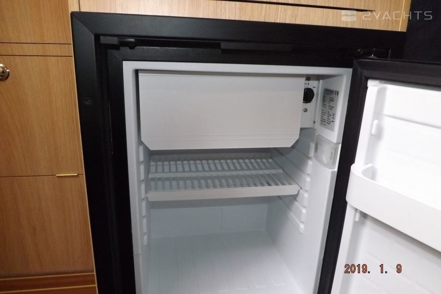 Boat equipment features classical mainsail and bimini. It also boasts a flat screen tv, heating, an audio system and inside speakers. The fully-equipped galley includes a cooker, sink and kitchen utensils.