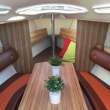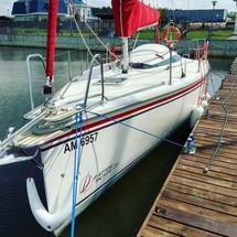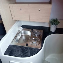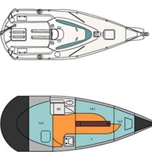 Boat equipment features classical mainsail. It also boasts a heating, an audio system and inside speakers. The fully-equipped galley includes a cooker, sink and kitchen utensils.