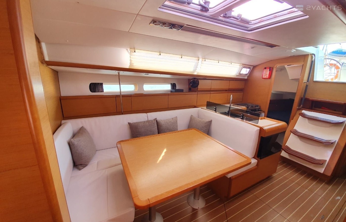 Boat equipment features classical mainsail, bimini and outside gps plotter. It also boasts an an audio system and inside speakers. The fully-equipped galley includes an oven, cooker, sink and kitchen utensils.