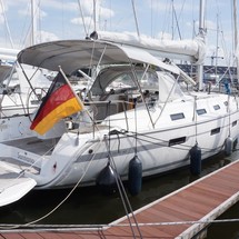 Boat equipment features classical mainsail, bimini and bow thruster. It also boasts a heating, an audio system, outside speakers and inside speakers. The fully-equipped galley includes a coffee machine, oven, cooker, sink and kitchen utensils.