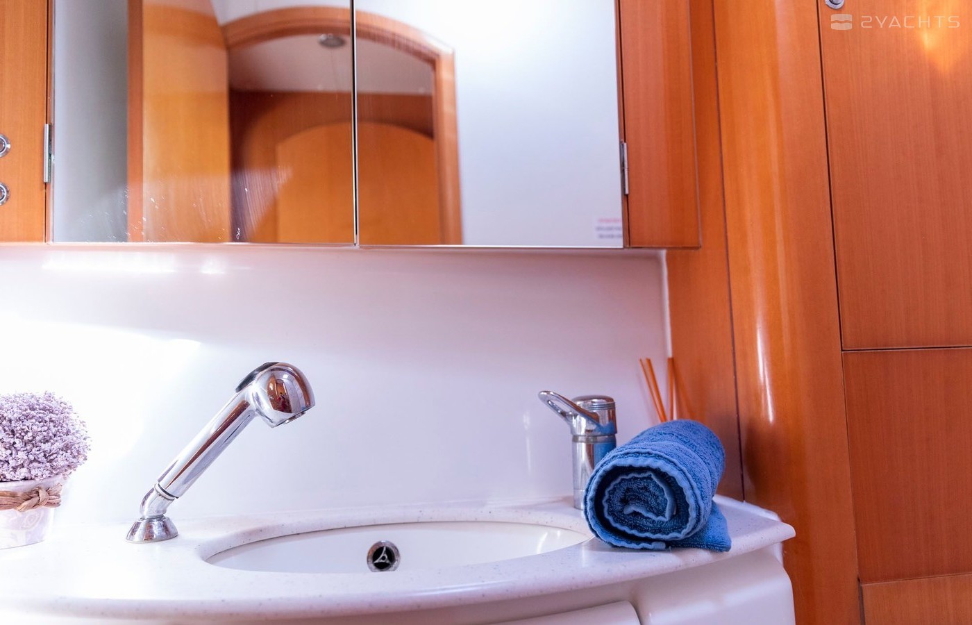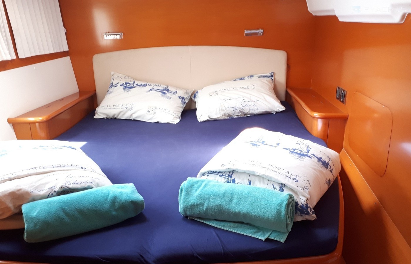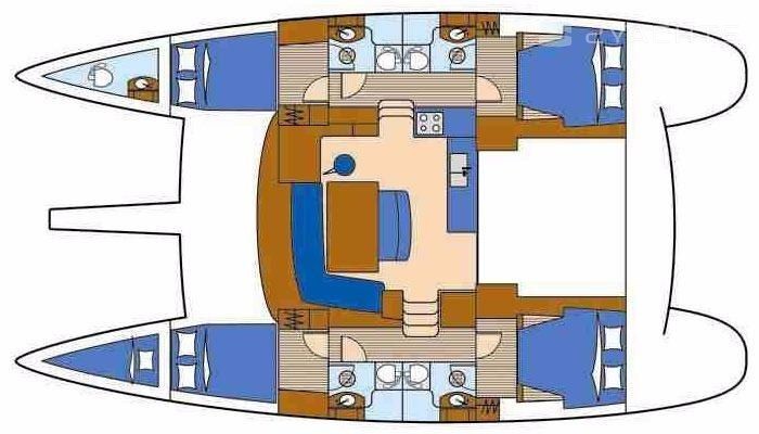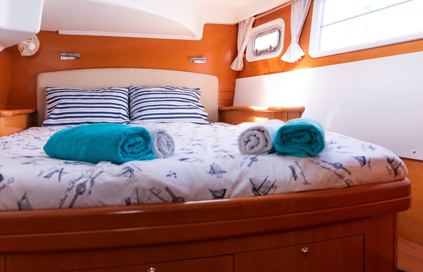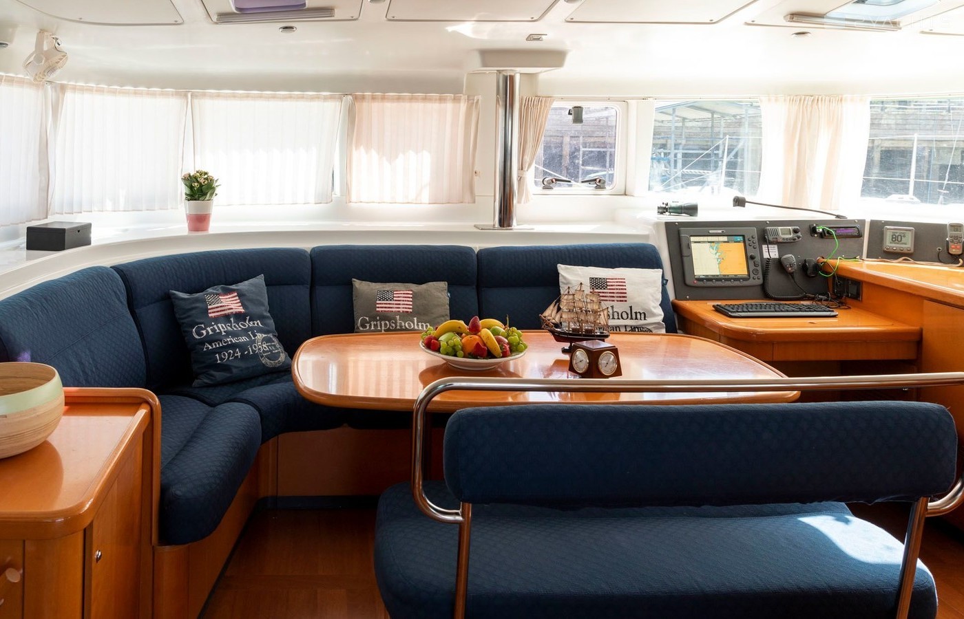 Boat equipment features classical mainsail, bimini and outside gps plotter. It also boasts a heating, an audio system, outside speakers, stand up paddle and inside speakers. The fully-equipped galley includes an oven, cooker, sink and kitchen utensils.