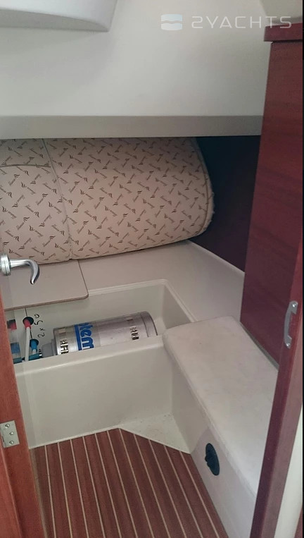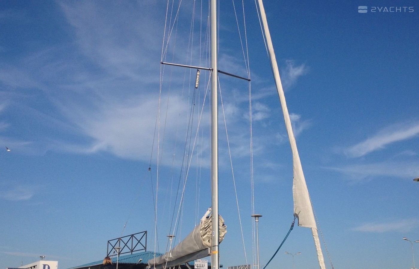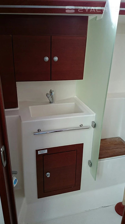 Boat equipment features classical mainsail, radar, salon gps plotter, bimini and bow thruster. It also boasts a heating, an audio system, outside speakers and inside speakers. The fully-equipped galley includes an oven, cooker, sink and kitchen utensils.
