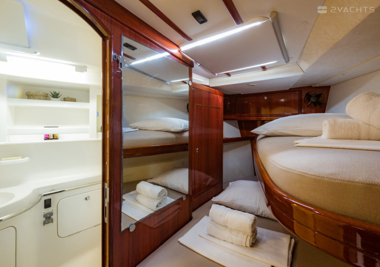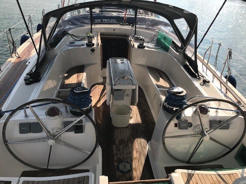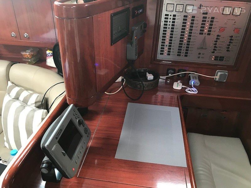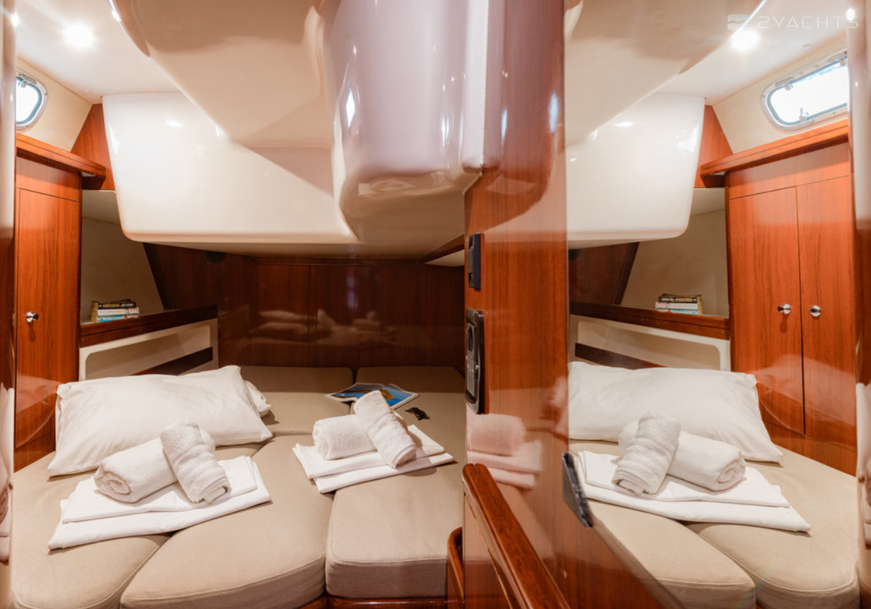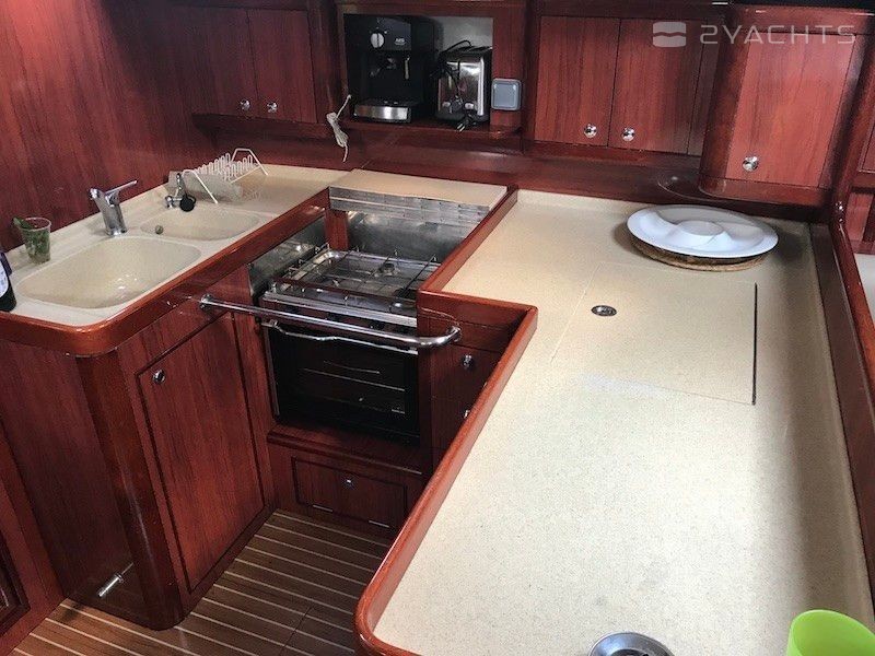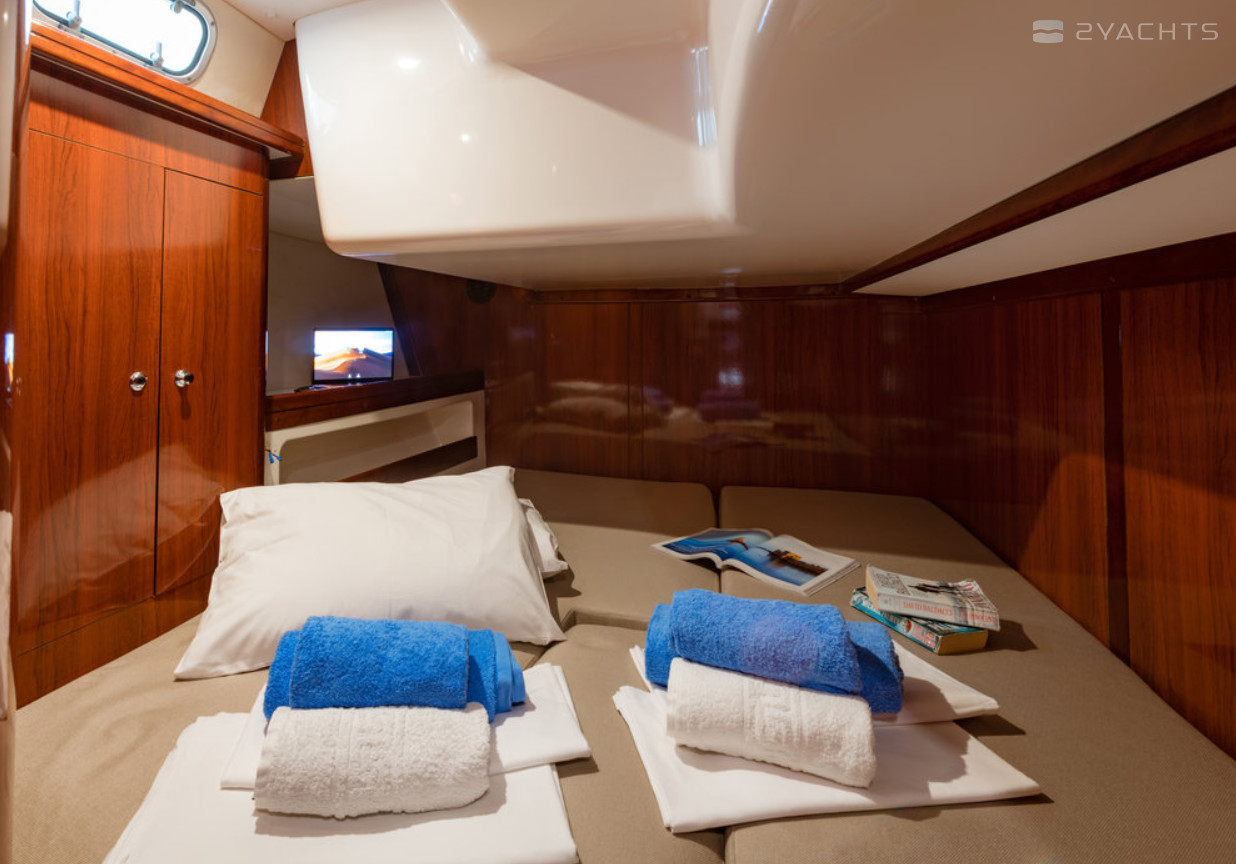 Boat equipment features classical mainsail, radar, generator, bimini and bow thruster. It also boasts a flat screen tv, heating, air conditioning, an audio system and outside speakers. The fully-equipped galley includes a microwave, oven, cooker, sink and kitchen utensils.