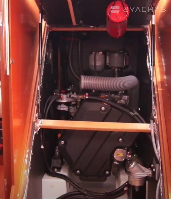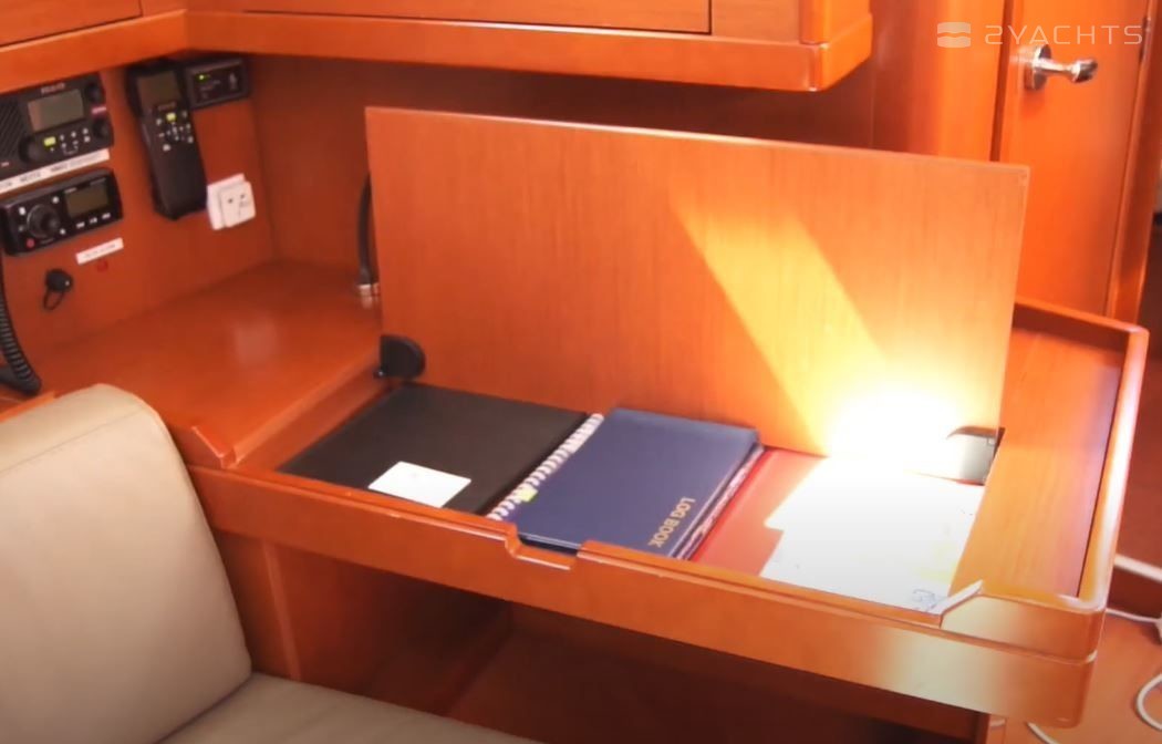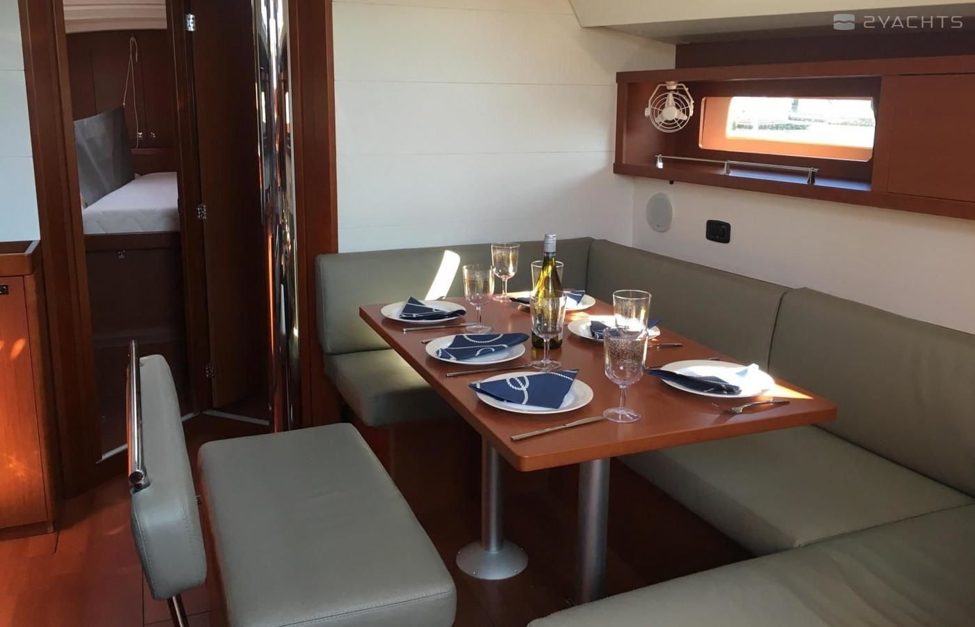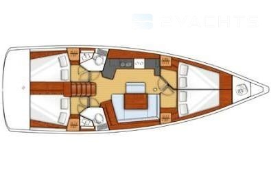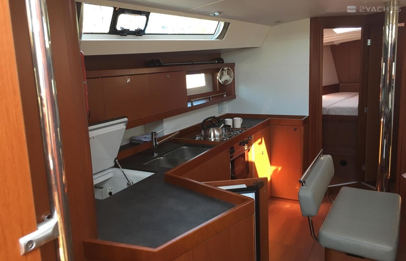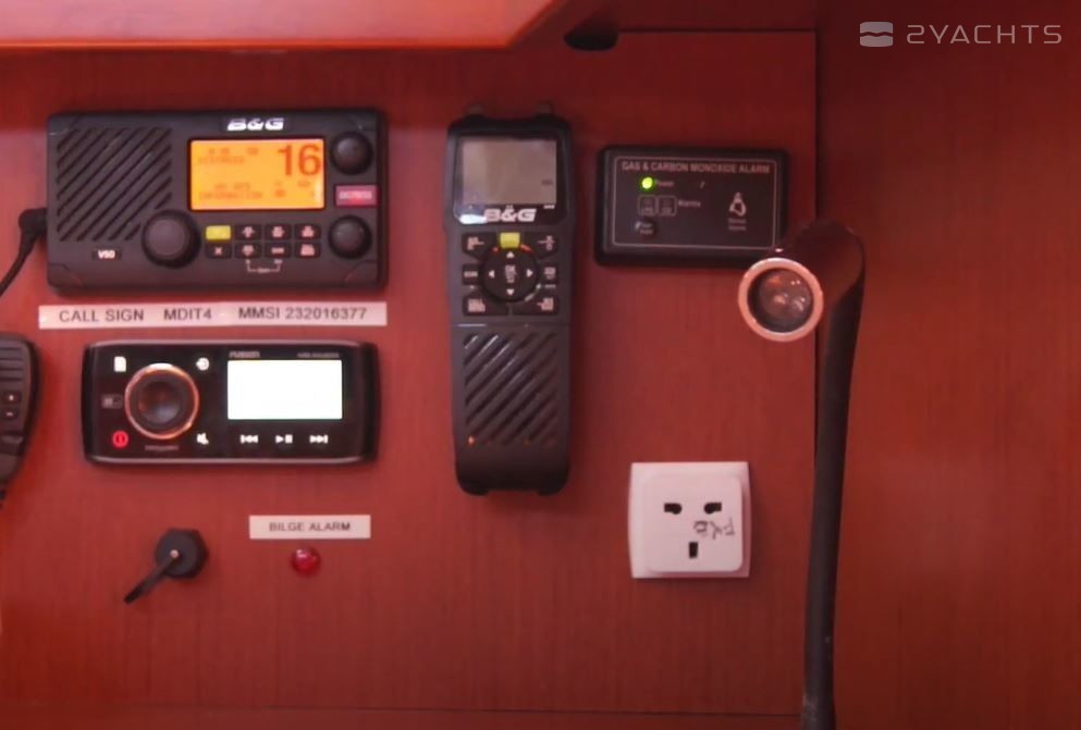 Boat equipment features classical mainsail, bimini and bow thruster. It also boasts a heating, an audio system, outside speakers and inside speakers. The fully-equipped galley includes an oven, cooker, sink and kitchen utensils.