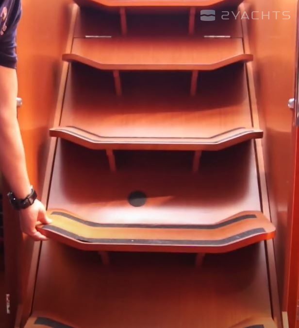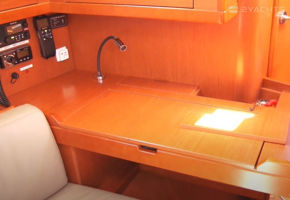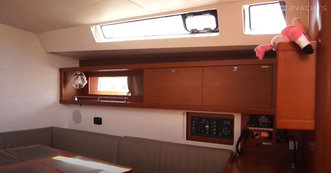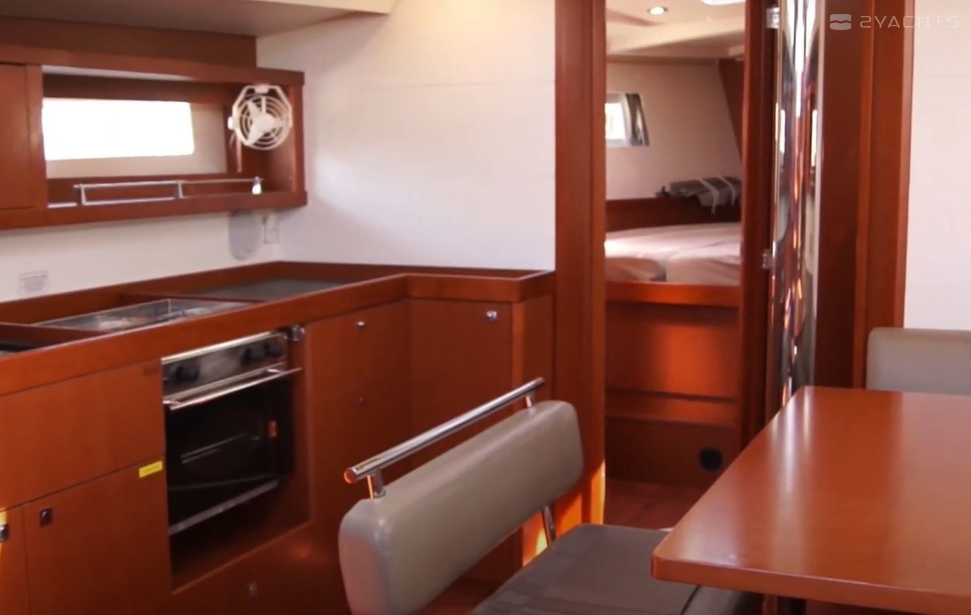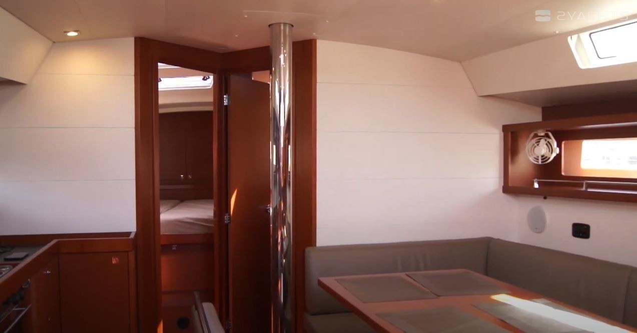 Boat equipment features classical mainsail, bimini and bow thruster. It also boasts a heating, an audio system, outside speakers and inside speakers. The fully-equipped galley includes an oven, cooker, sink and kitchen utensils.