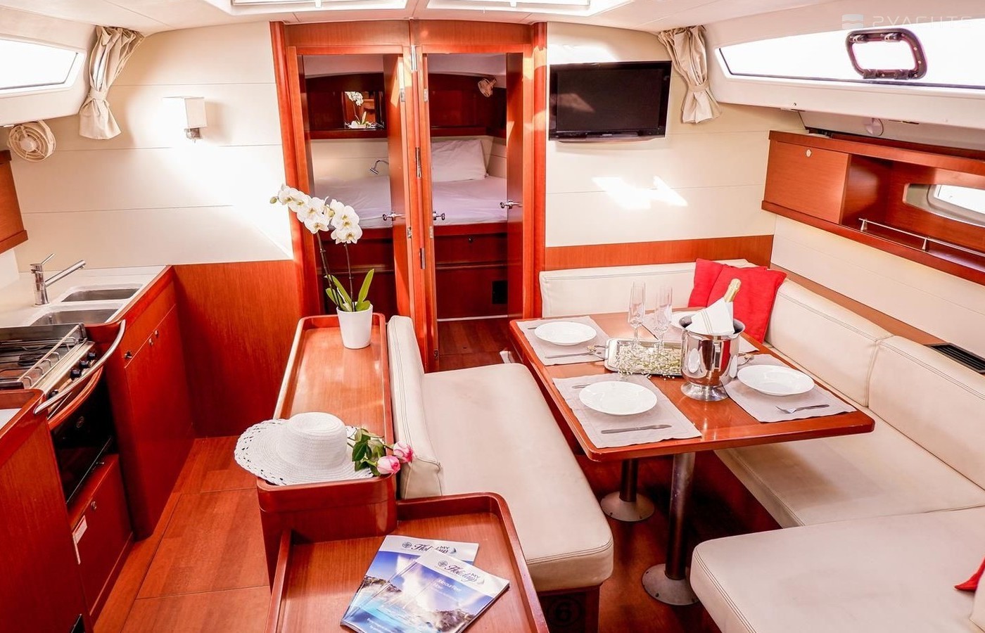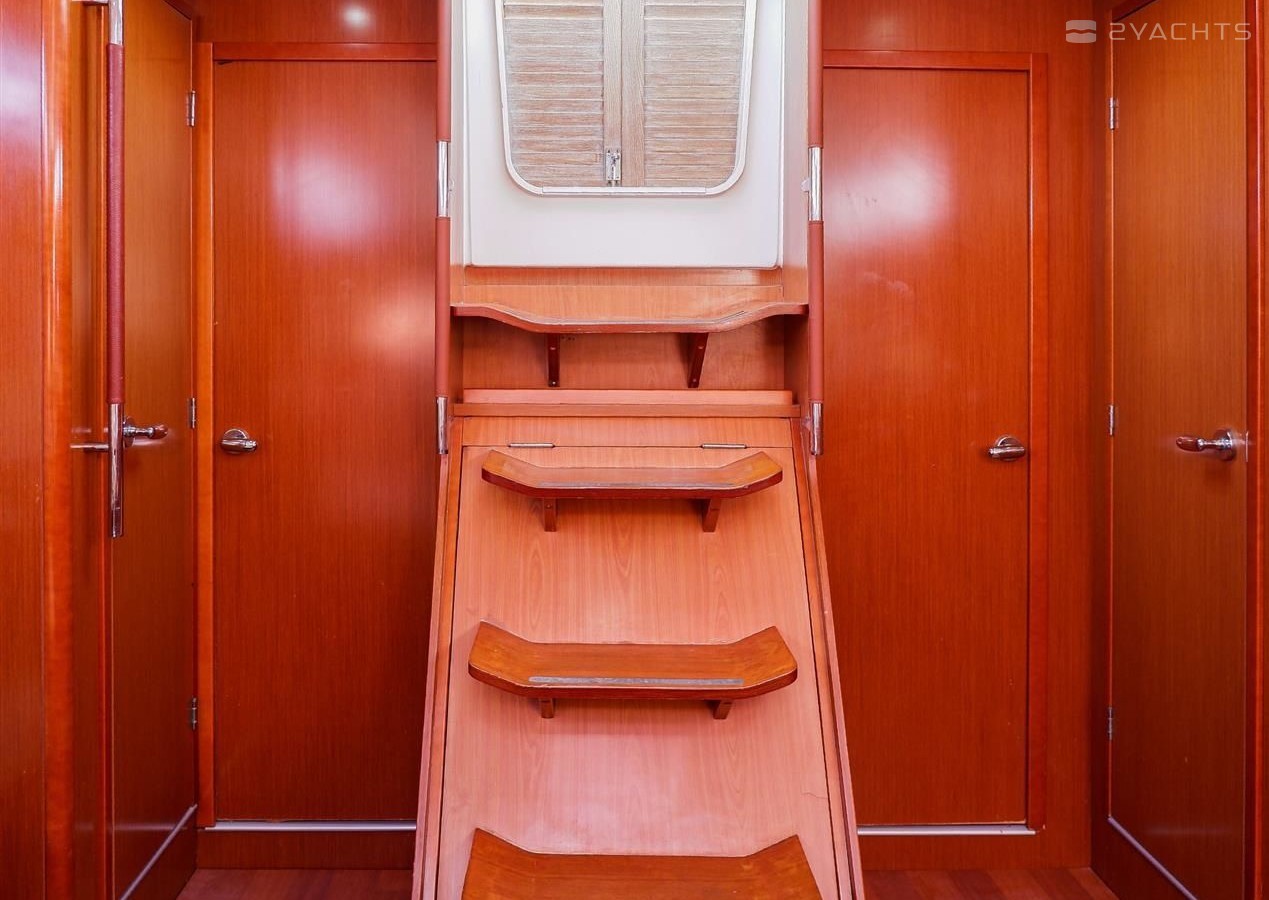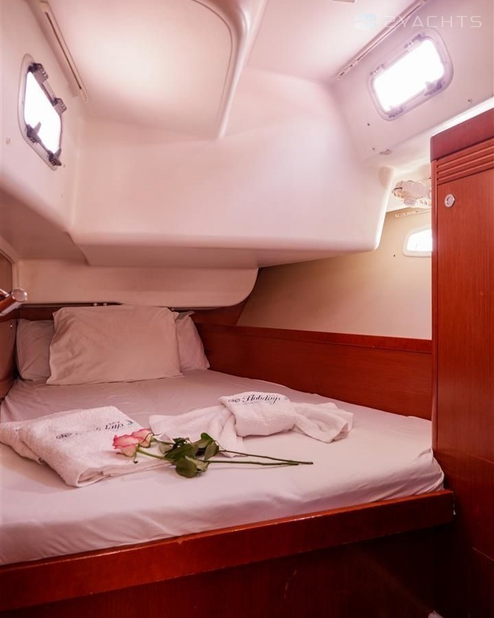 Boat equipment features classical mainsail, generator, salon gps plotter, bimini and bow thruster. It also boasts a flat screen tv, heating, air conditioning, an audio system and dvd player. The fully-equipped galley includes a freezer, oven, cooker, sink and kitchen utensils.
