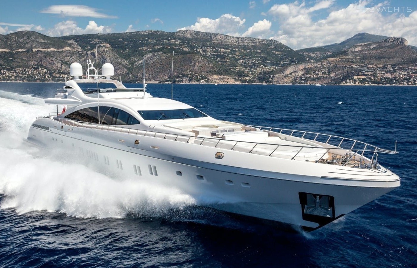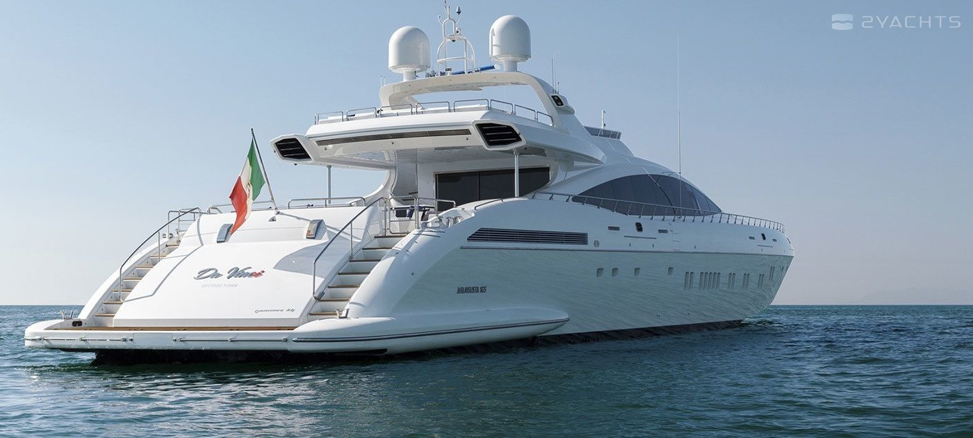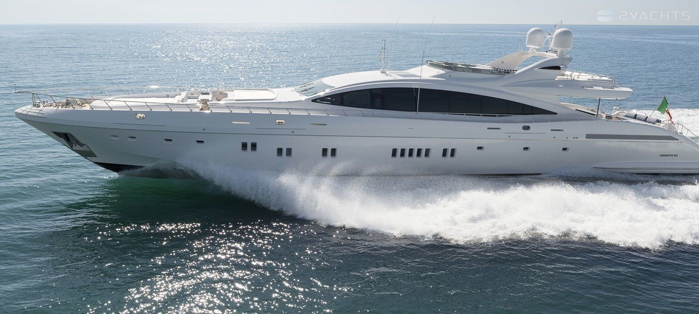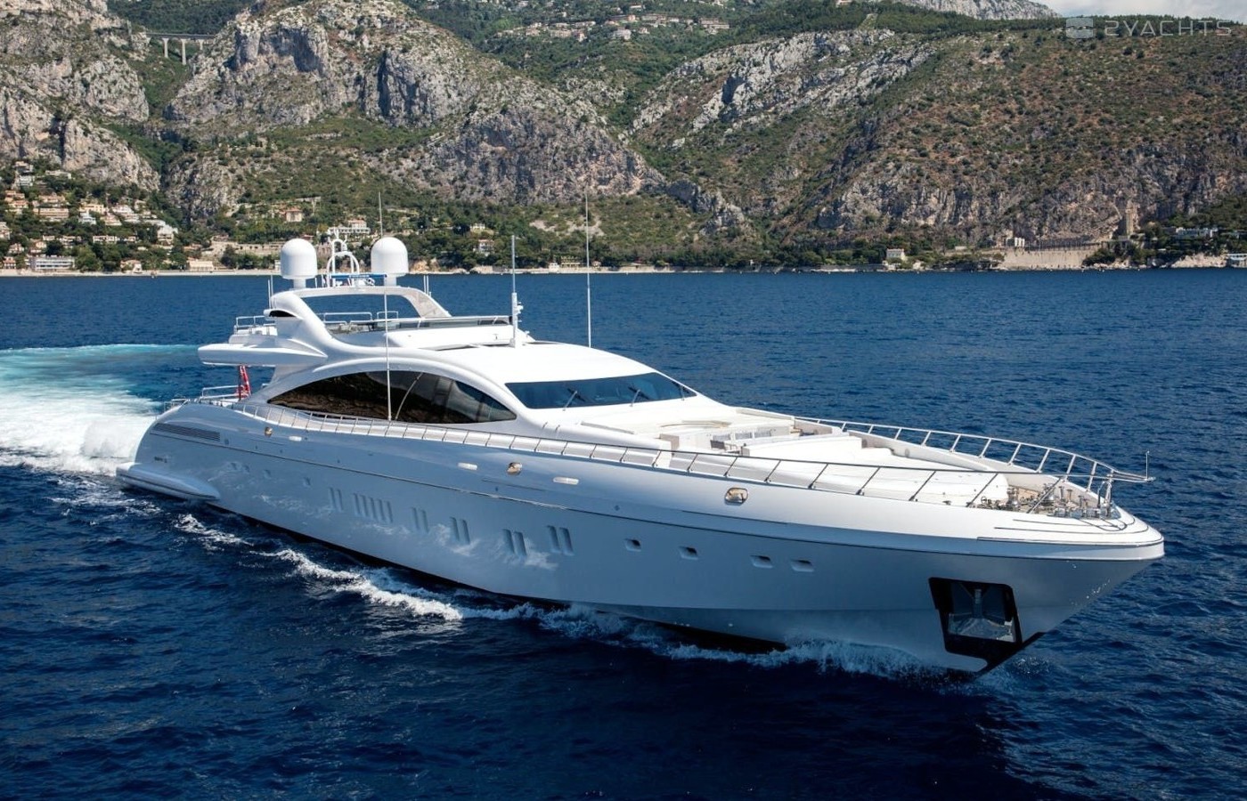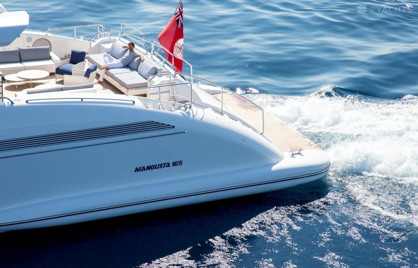 5-cabin motor yacht Mangusta 165E - Da Vinci was built in 2017, and it is docked in Port d'Ibiza, Spain.