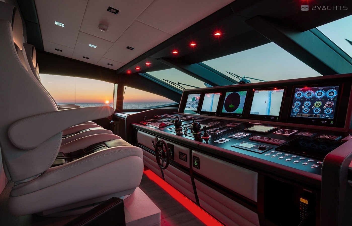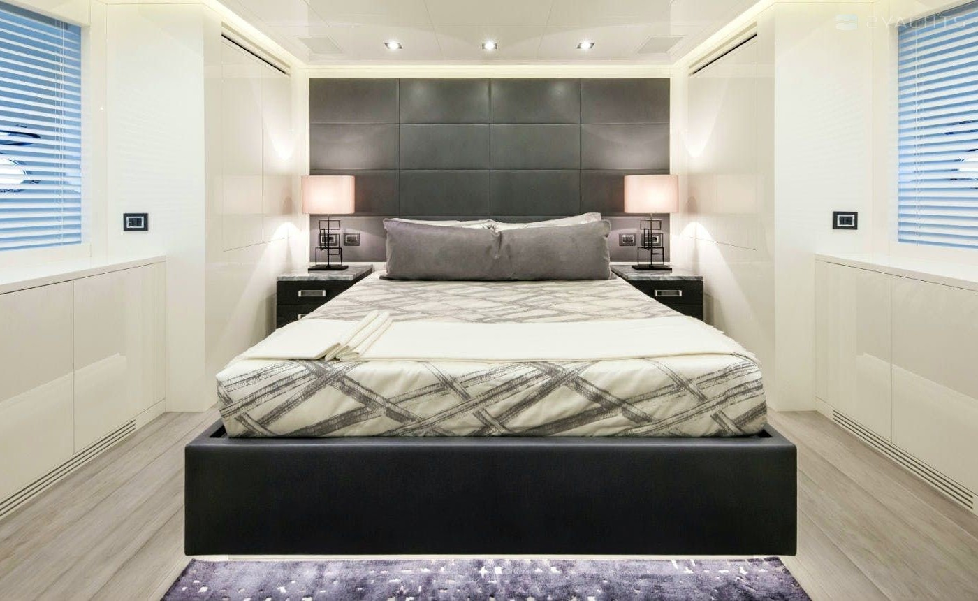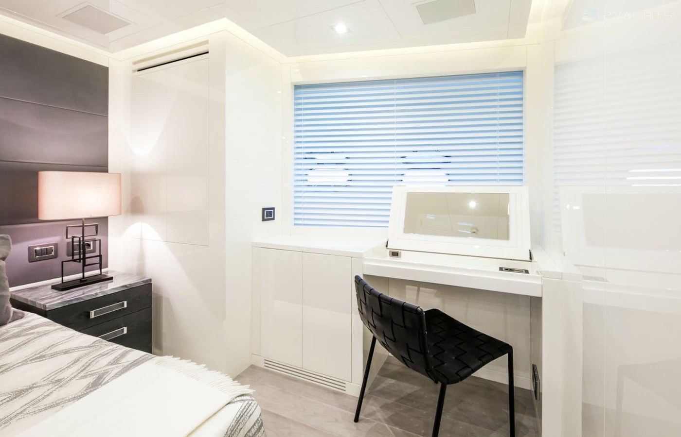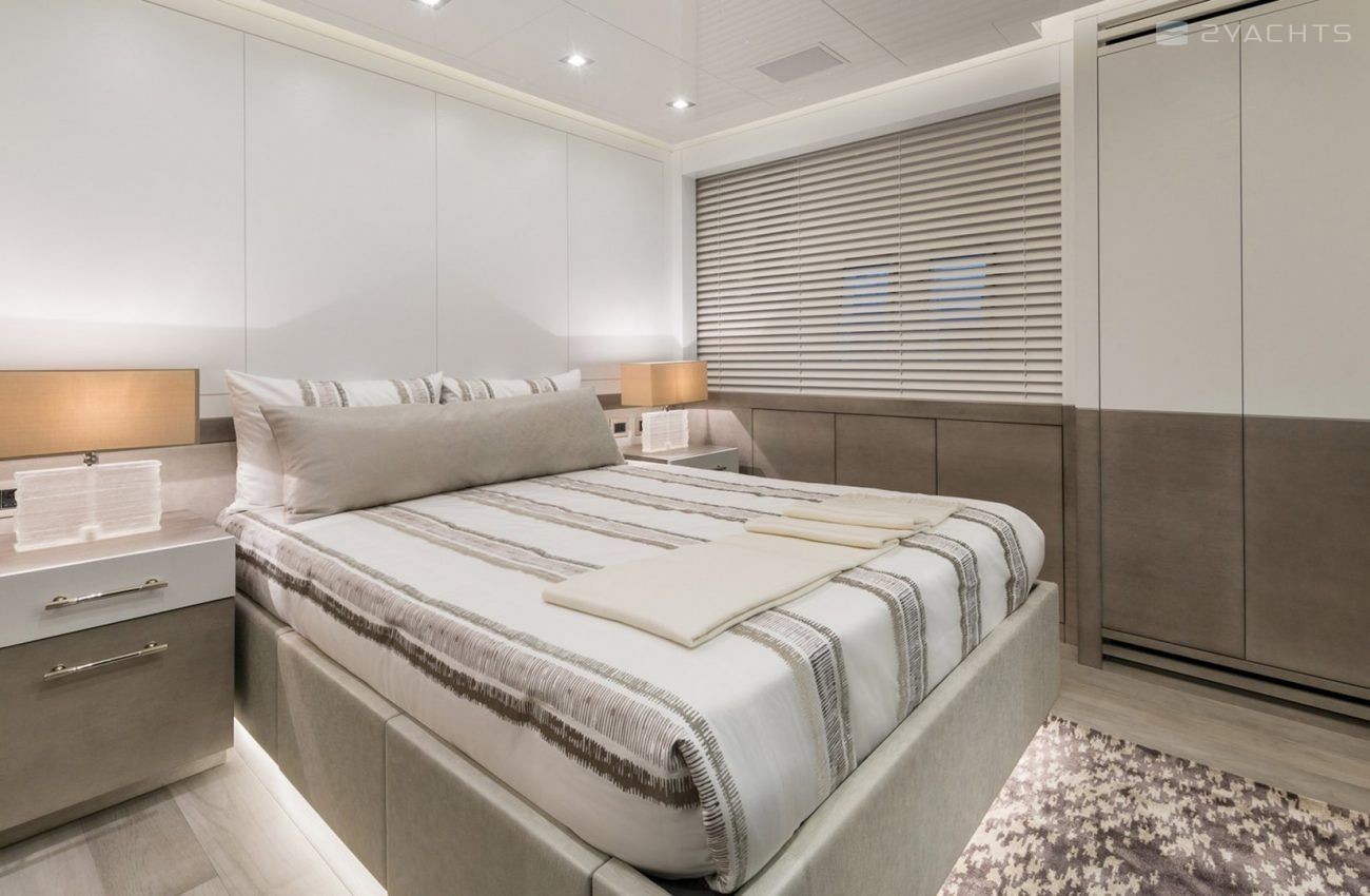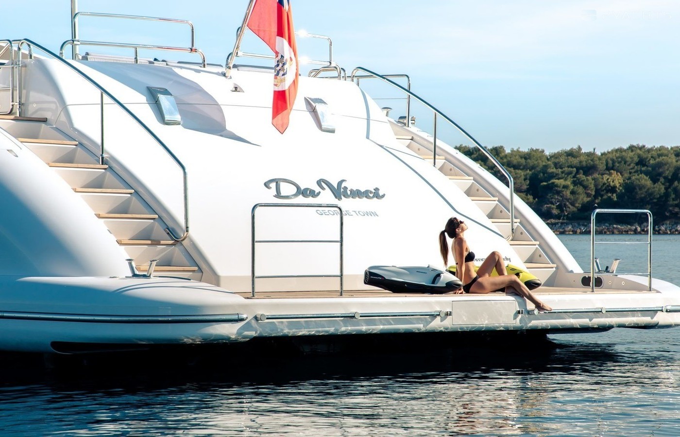 5-cabin motor yacht Mangusta 165E - Da Vinci was built in 2017, and it is docked in Port d'Ibiza, Spain.