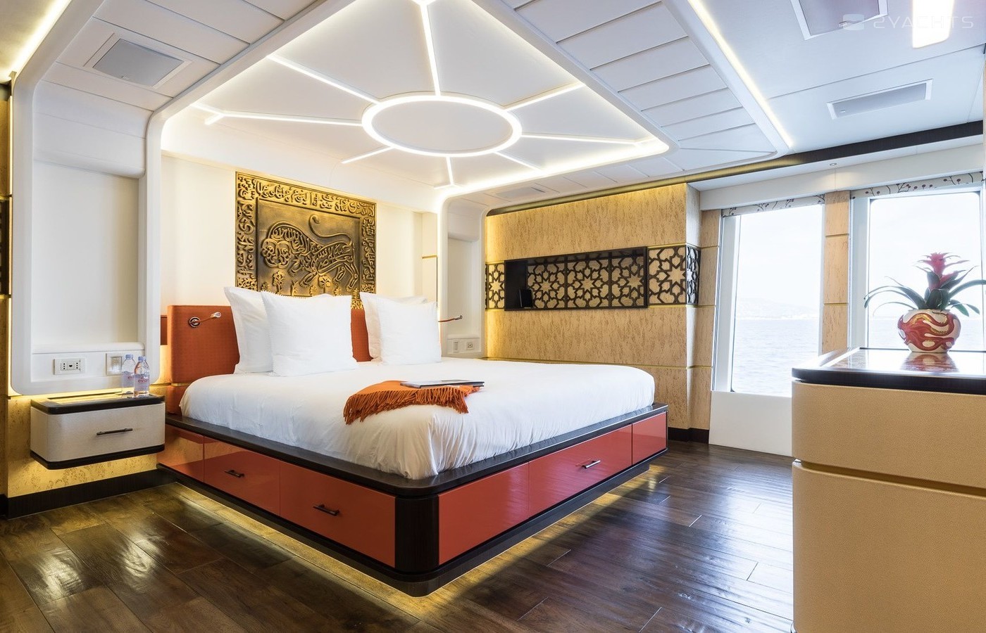 Boat equipment features radar, generator, salon gps plotter, bimini and outside gps plotter. It also boasts a jet ski, flat screen tv, heating, air conditioning and audio system. The fully-equipped galley includes a microwave, dishwasher, freezer, coffee machine and oven.