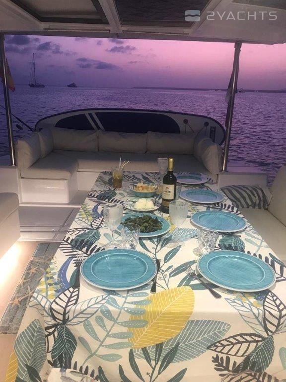 Boat equipment features generator, bimini and outside gps plotter. It also boasts a flat screen tv, heating, air conditioning, an audio system and outside speakers. The fully-equipped galley includes a dishwasher, freezer, coffee machine, oven and cooker.
