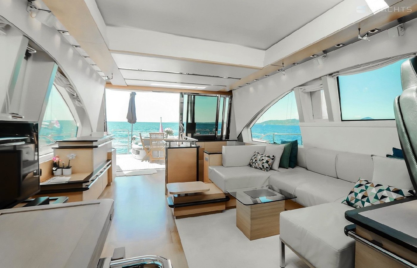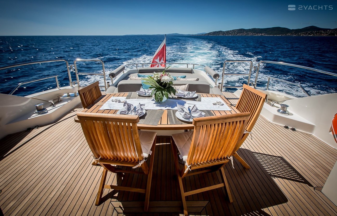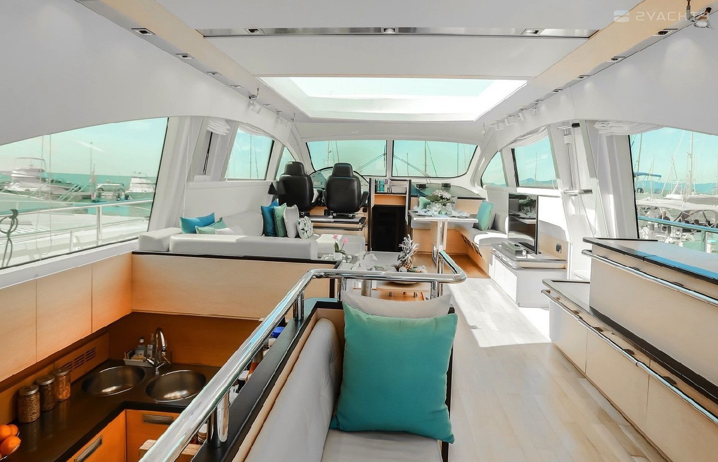 Boat equipment features radar, generator, salon gps plotter, bbq and bimini. It also boasts a flat screen tv, heating, air conditioning, washing machine and audio system. The fully-equipped galley includes a microwave, ice maker, freezer, coffee machine and oven.