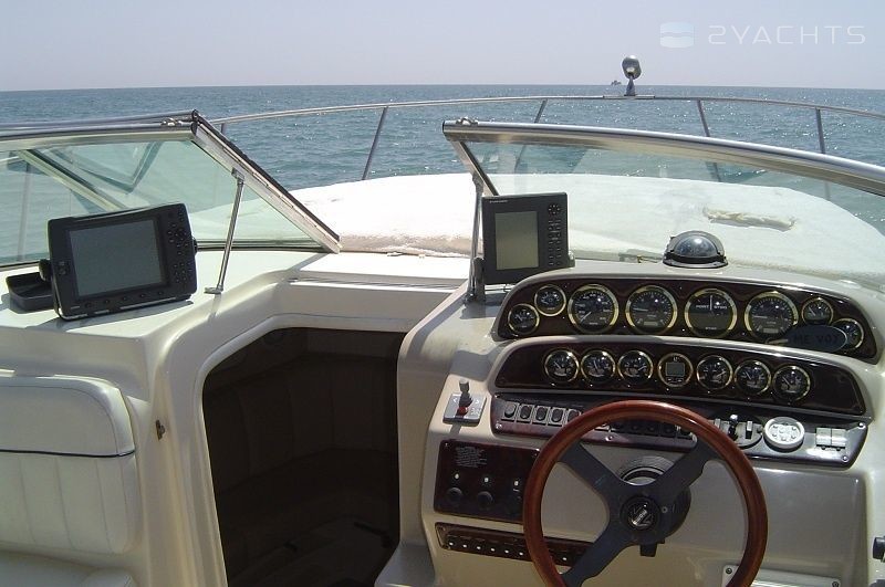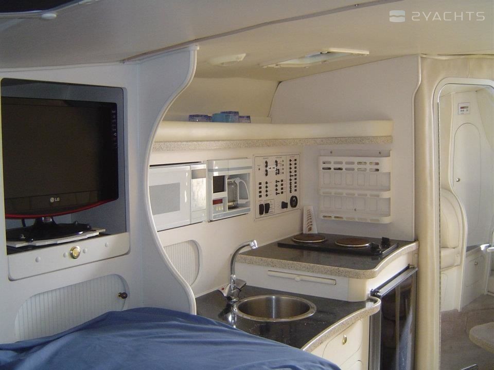 Boat equipment features radar, bimini and bow thruster. It also boasts a flat screen tv, an audio system, outside speakers and inside speakers. The fully-equipped galley includes a microwave, cooker, sink and kitchen utensils.