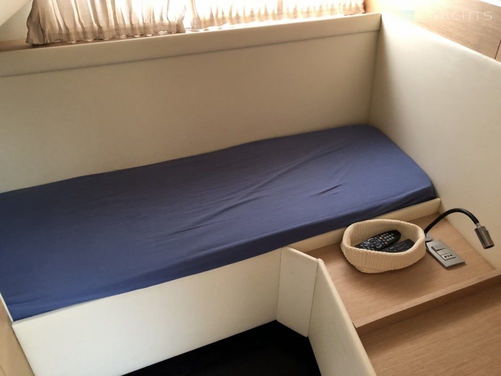 Boat equipment features solar panels, salon gps plotter, bbq, bimini and bow thruster. It also boasts an air conditioning, an audio system, outside speakers, wakeboard and inside speakers. The fully-equipped galley includes a freezer, cooker, sink and kitchen utensils.