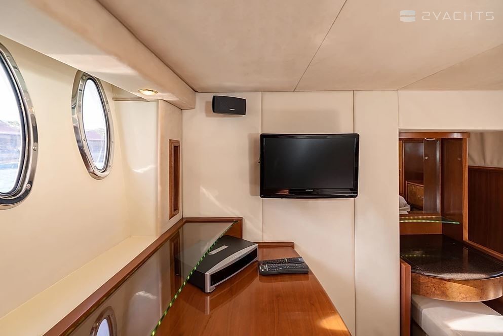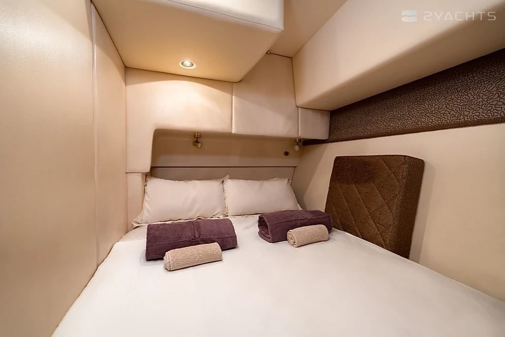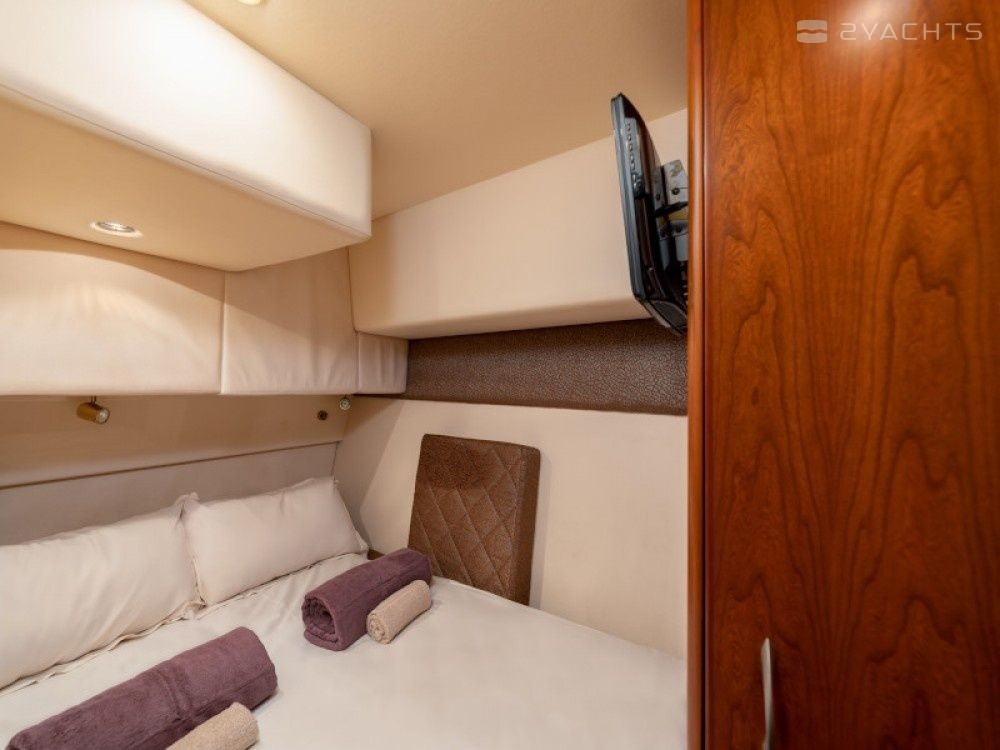 Boat equipment features generator, salon gps plotter, bbq, bimini and outside gps plotter. It also boasts a flat screen tv, air conditioning, an audio system, outside speakers and flybridge. The fully-equipped galley includes a microwave, ice maker, freezer, oven and cooker.