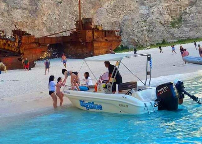 This motorboat is operated by the charter company The Big Blue Motorboat Rentals.