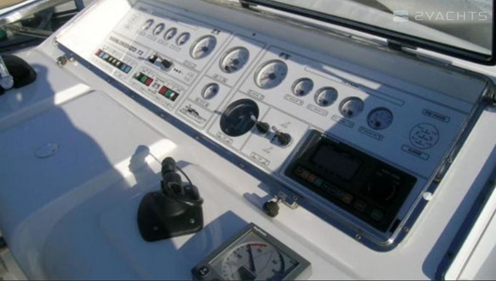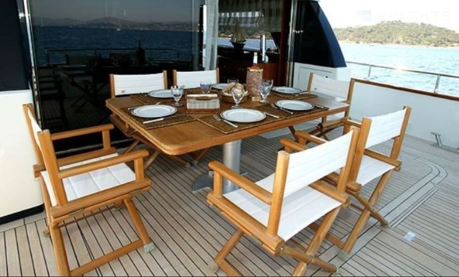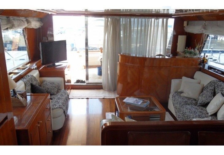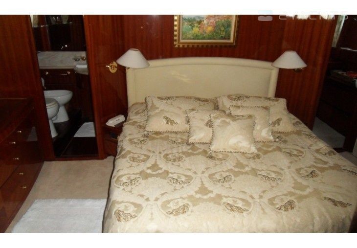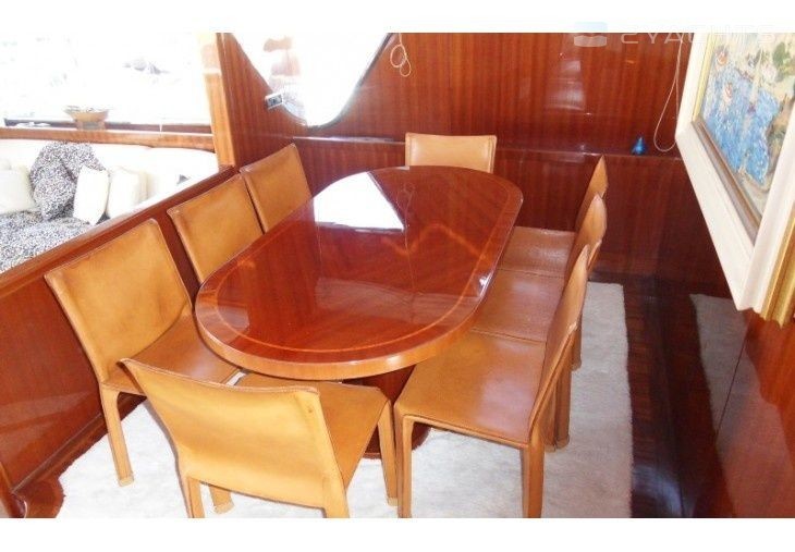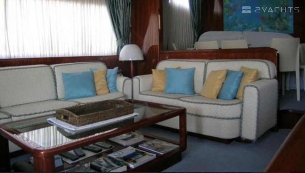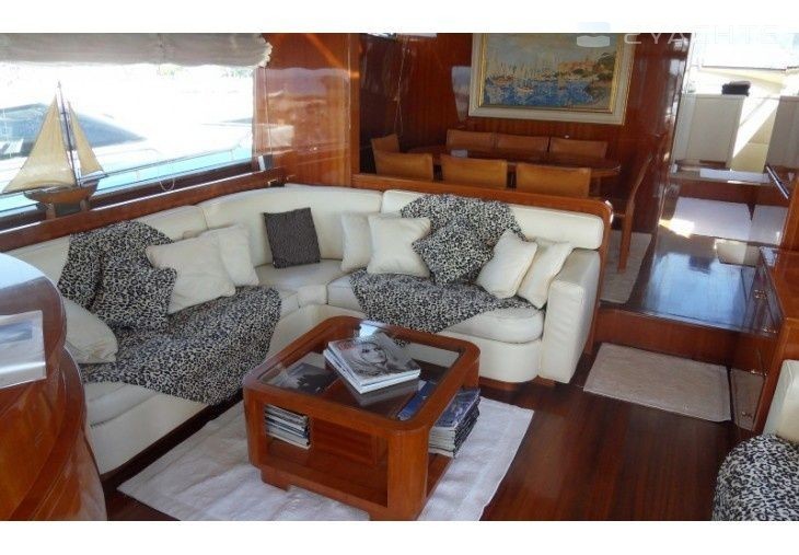 Boat equipment features radar, generator, salon gps plotter, bimini and bow thruster. It also boasts a flat screen tv, heating, air conditioning, an audio system and outside speakers. The fully-equipped galley includes a microwave, oven, cooker, sink and kitchen utensils.