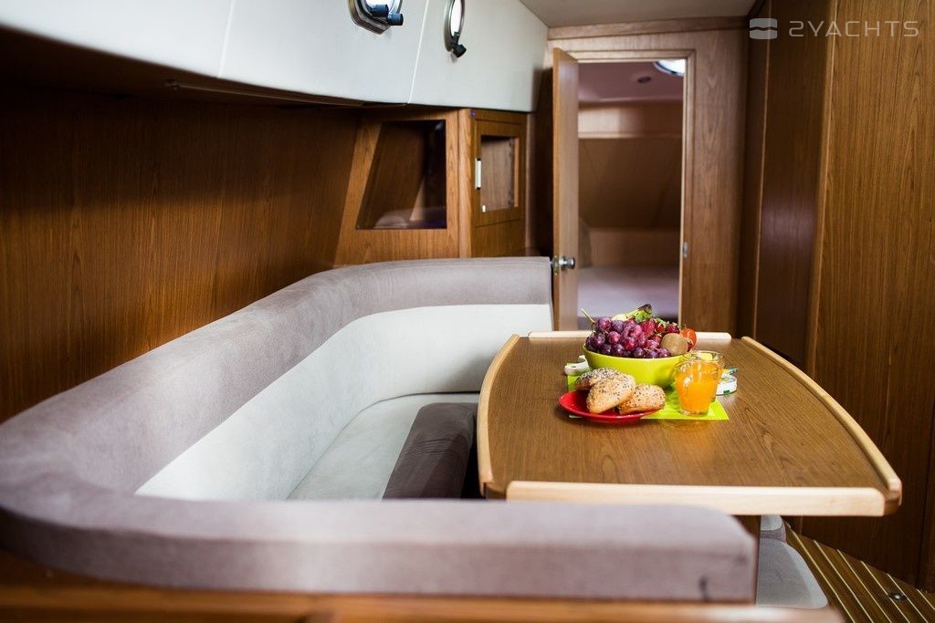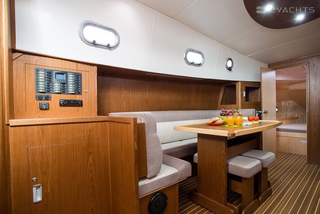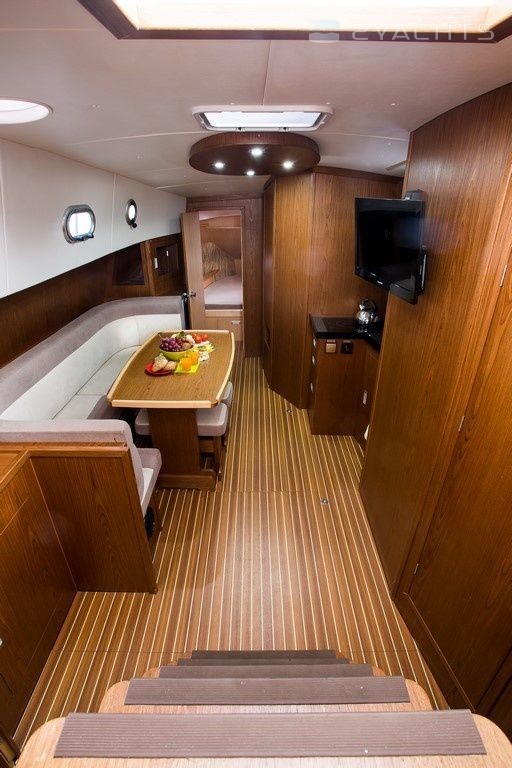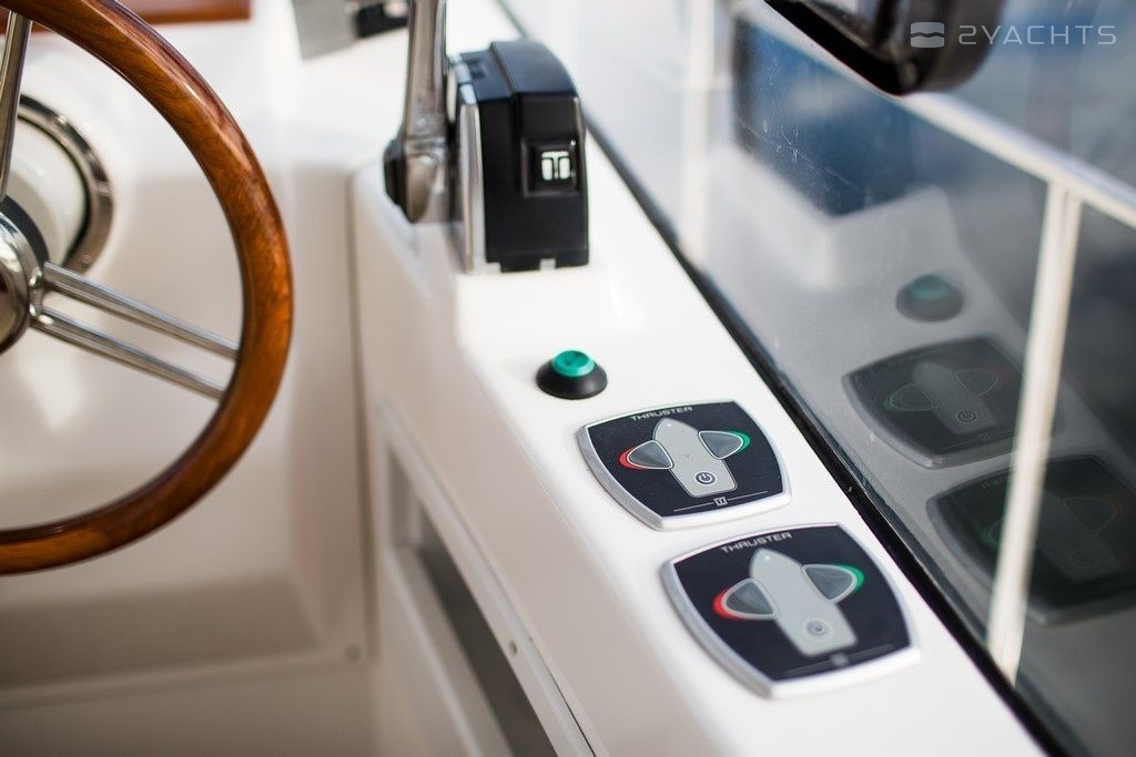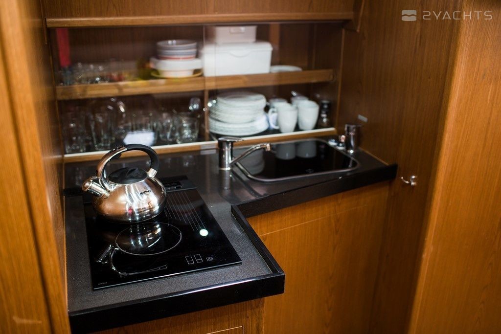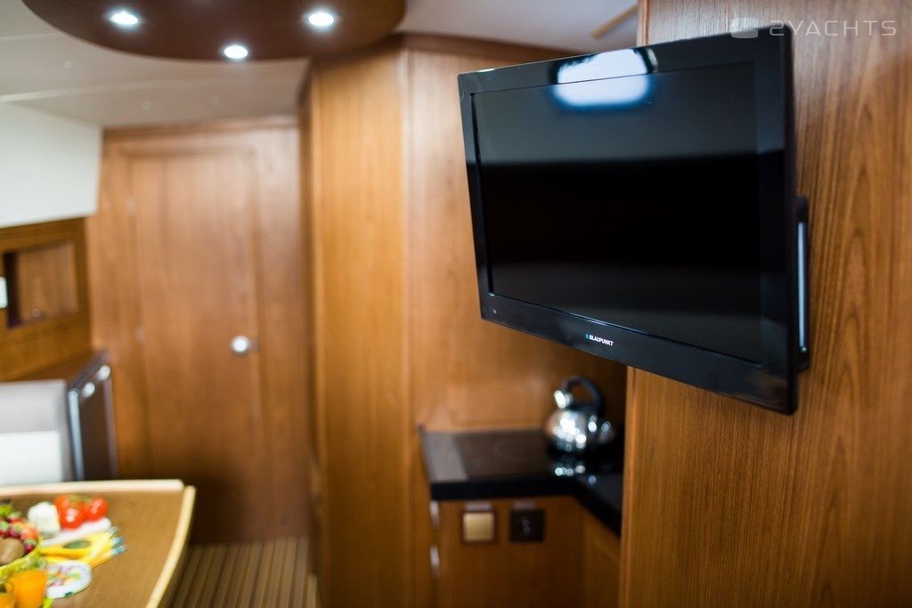 Boat equipment features generator, bbq, bimini and bow thruster. It also boasts a flat screen tv, heating, an audio system, outside speakers and inside speakers. The fully-equipped galley includes a cooker, sink and kitchen utensils.